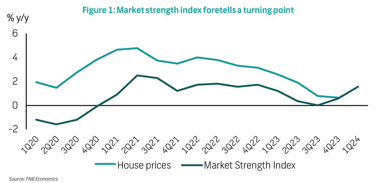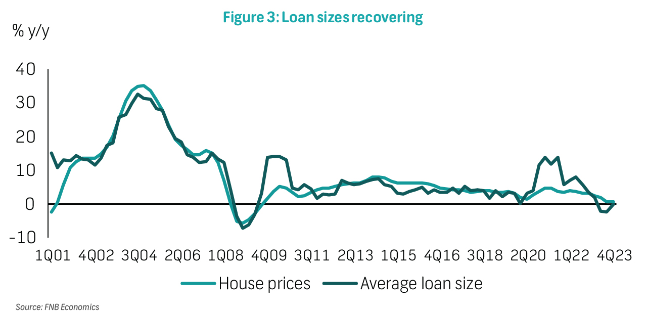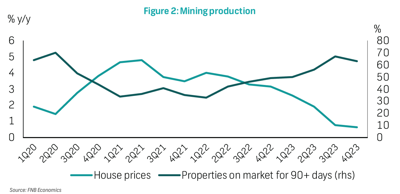 We conduct a quarterly FNB Estate Agents survey covering a wide range of topics in the housing market, including the average time it takes to sell a property. Between 1Q22 and 3Q23, the proportion of properties that stayed on market for 90 days or longer increased from 33% to 67%. In 4Q23, however, these volumes shrank to 63%, marking the first decline since the commencement of the rate hiking cycle. While these are still elevated, the turn, assuming it is sustained, indicates a potential lift in house price growth on the horizon. Generally, there is an inverse relationship between time on market and house price growth (Figure 2).