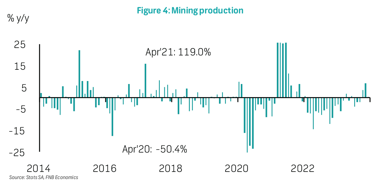 In 2023, mining output experienced a moderate decline of 0.4%, showing a significant improvement from the steep 7.2% decline in 2022. The improvement was driven by growth in coal, platinum group metals, and gold output. However, the domestic mining sector still faces challenges due to subdued external demand, low commodity prices, and domestic infrastructure constraints.