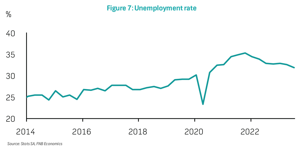 Also on Tuesday, Stats SA will release labour market data for 4Q23 from the Quarterly Labour Force Survey (QLFS). In 3Q23, the QLFS data showed that the official unemployment rate fell slightly to 31.9% in 3Q23 from 32.6% in 2Q23, and a peak of 35.3% 4Q21. This reflected a quarterly employment increase of 398 558 (or 2.4% q/q) to 16 744 781, while the level of unemployment fell by 72 243 (or 0.9% q/q) to 7 849 131. Employment increased by 979 378 in 3Q23 compared to the same quarter last year. Despite economic growth challenges, the labour market has added 2 462 774 jobs over the past eight consecutive quarters.
