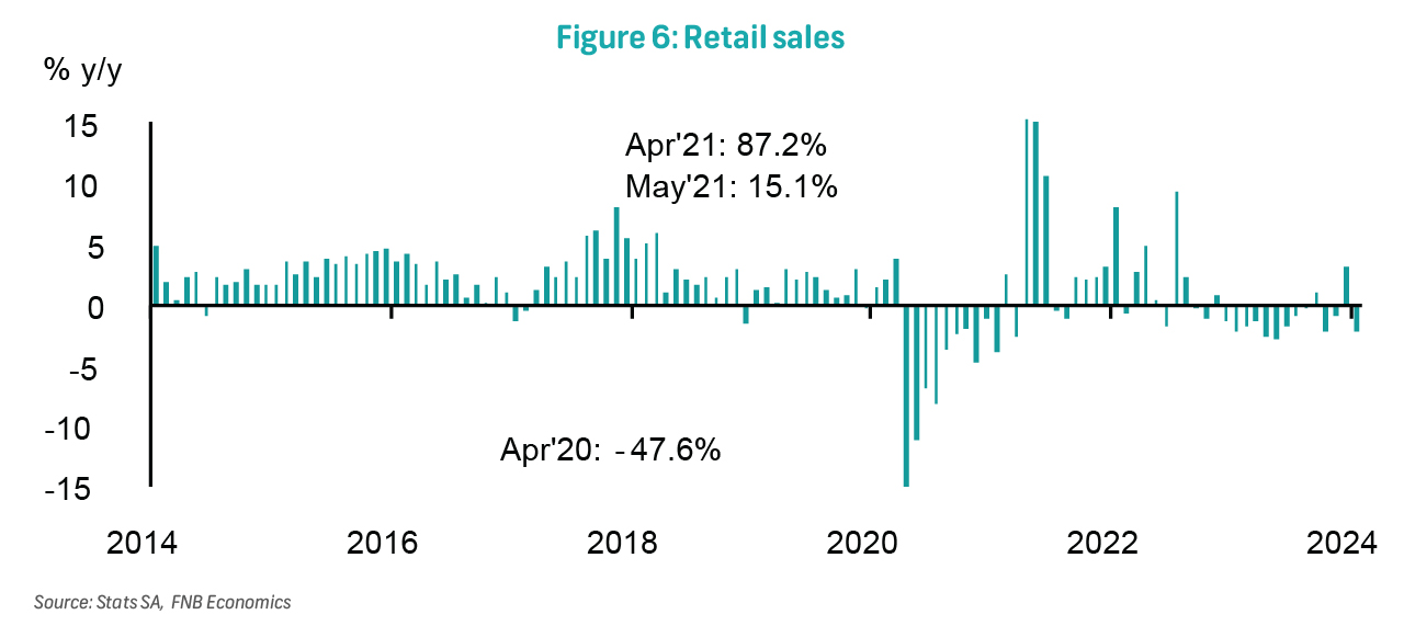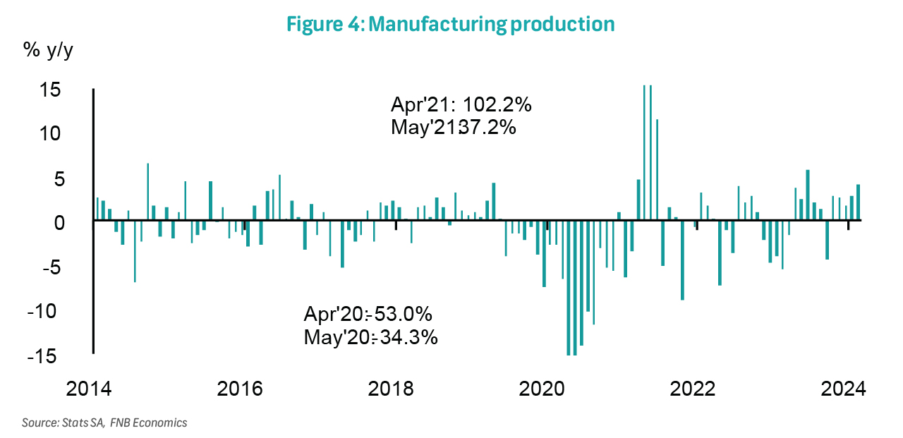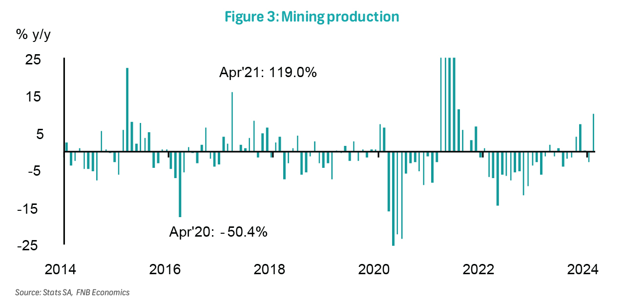 Year-to-date, mining output is up by 3.3% y/y, consistent with our view that activity in the sector will recover this year after declining by 0.3% in 2023 and 7.1% y/y in both 2023 and 2022. The envisaged recovery underscores the reduction in load-shedding intensity. However, activity in this sector will be constrained by prevailing port and rail inefficiencies, as well as the potential impact of deteriorating water infrastructure. External growth dynamics are also critical, particularly as growth in China experiences moderation.