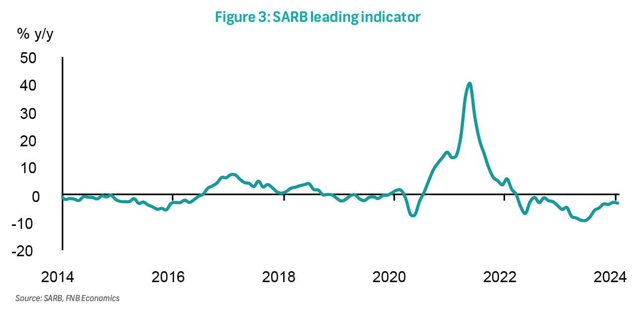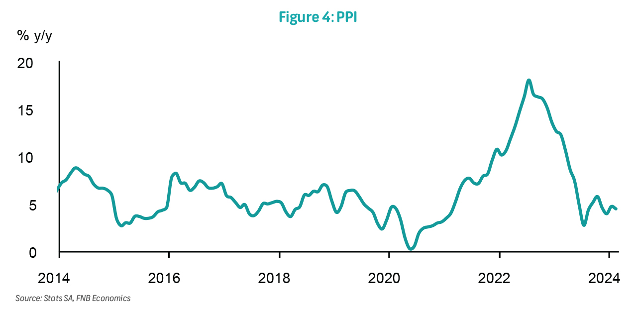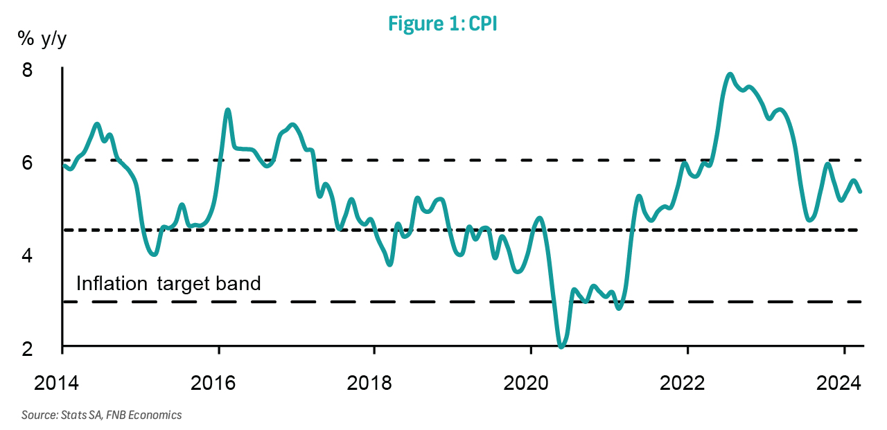 Consumer inflation slowed to 5.3% in March from 5.6% in February, with monthly pressure of 0.8%. Driving the monthly pressure was core inflation, which contributed 0.5ppts, while fuel added the other 0.3ppt. Core inflation lifted by 0.7% m/m and 4.9% y/y, primarily driven by education, housing, as well as alcoholic beverages and tobacco. Fuel increased by 5.3% m/m and 6.2% y/y, while food and NAB inflation continued to ease, settling at 5.1% y/y from 6.1% previously. We expect monthly pressure on headline inflation to slow in April as the weight of periodical surveys fall. Nevertheless, fuel inflation should continue to exert upward pressure to headline inflation. Annual headline inflation could remain flat at 5.3% y/y in April and average 5.2% over 2024. This view is threatened by hostile weather that has affected crop estimates, higher transport costs as geopolitical tensions remain elevated, as well as a weak rand if US interest rate cuts are delayed.