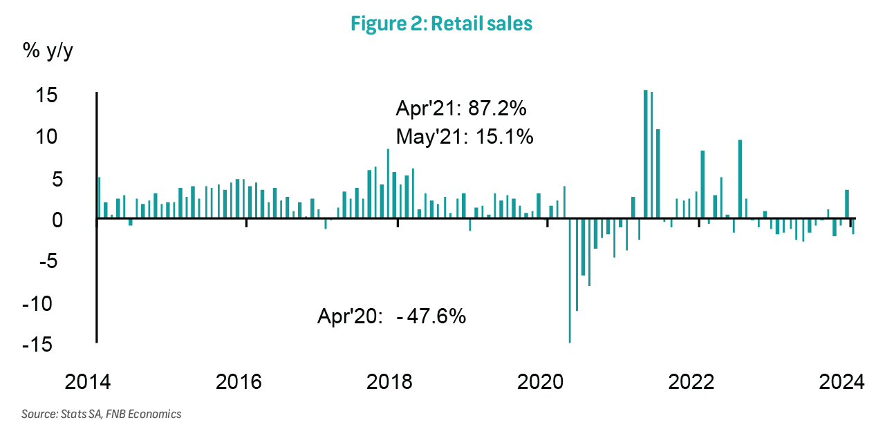 Retail sales fell by 0.8% y/y in February from a decline of 2.0% in January (revised from -2.1%). On a month-on-month basis, volumes rebounded by 0.4%, barely offsetting the 3.2% decline in January. Thus, volume sales in the last three months (Dec-Feb) are lower by 0.5% compared to the three months prior, implying that the retail industry is currently detracting from 1Q24 GDP growth. This means that the slight positivity in volumes growth signalled by the 1Q24 BER Retailer Survey is yet to reflect in official retail sales numbers. We expect the generally weak consumer demand environment to persist in the near term, driven by sticky inflation, high interest rates and depressed consumer confidence.