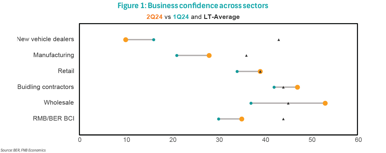 Despite pre-election jitters, the RMB/BER Business Confidence Index (BCI) for 2Q24 showed a slight improvement. Around a third of businesses (35%, up from 30% in Q1) expressed satisfaction with the current conditions. This broad-based improvement was seen in four out of the five surveyed sectors. However, confidence remained below the long-term average, suggesting that overall business conditions, though improving, still constrain robust economic activity (Figure 1).