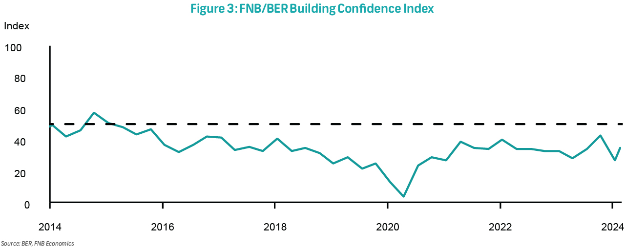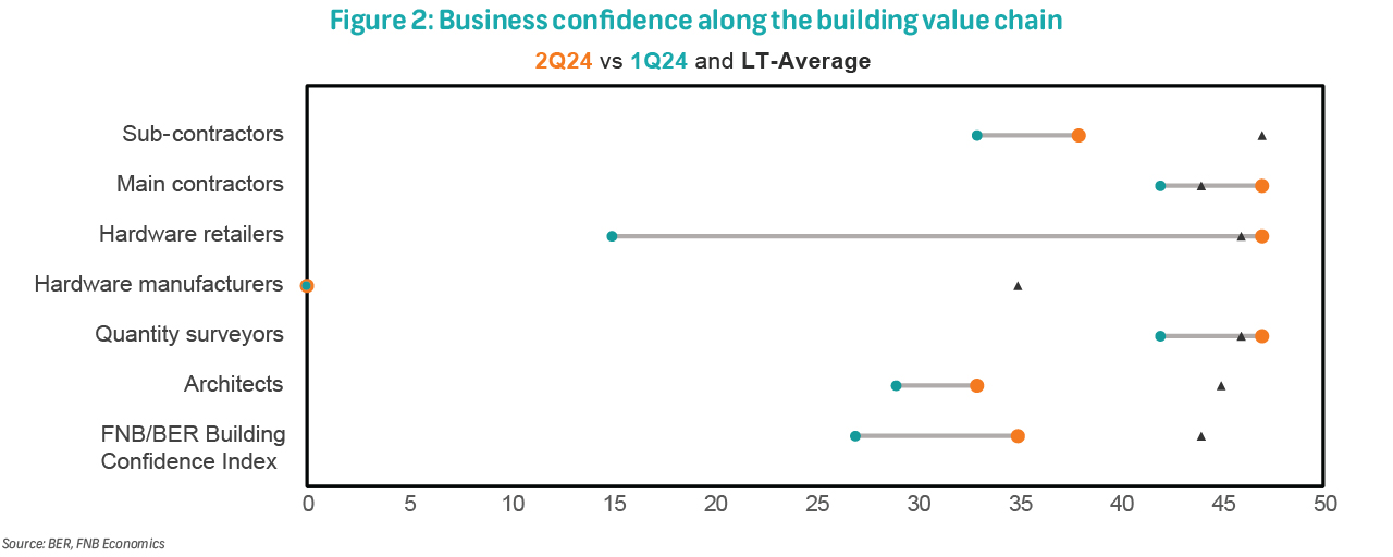 Similarly, the FNB/BER Building Confidence Index, which encompasses the entire building value chain (as opposed to just contractors as is in the BCI), also revealed improved sentiment. Interestingly, here the improvement was broad-based across the entire value chain, although still not at the historical average (Figure 2).