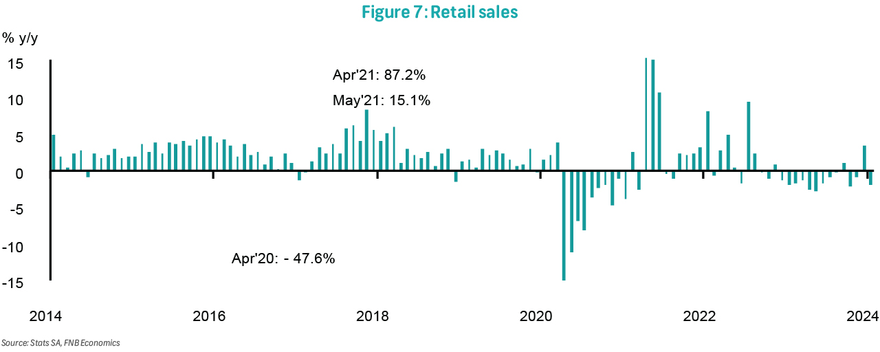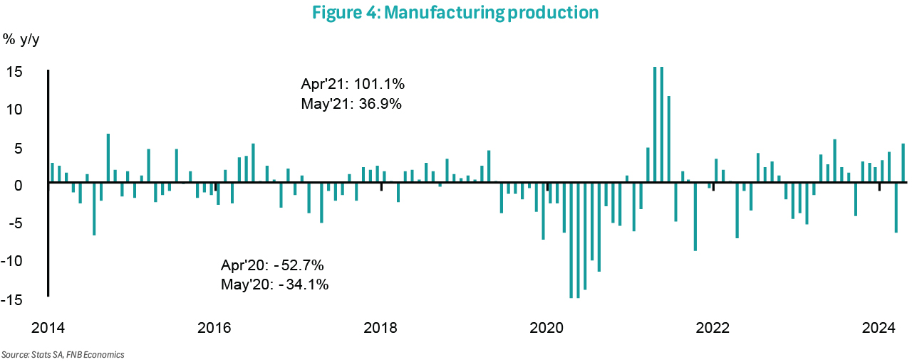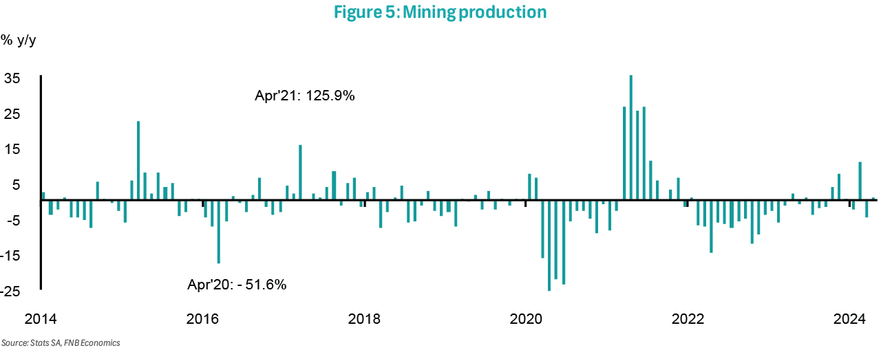 Total mining production, not seasonally adjusted, increased slightly by 0.7% y/y in April after declining by an upwardly revised 4.8% y/y (previously 5.8% y/y) in March. Seasonally adjusted output increased by 0.8% m/m, which was insufficient to reverse the 4.4% monthly decline in the prior month. The subdued monthly rebound, especially after the mining sector de-stocked in 1Q24, is concerning given that the country did not experience load-shedding in April. This likely reflects subdued, albeit stable, external demand and relatively weak commodity prices.