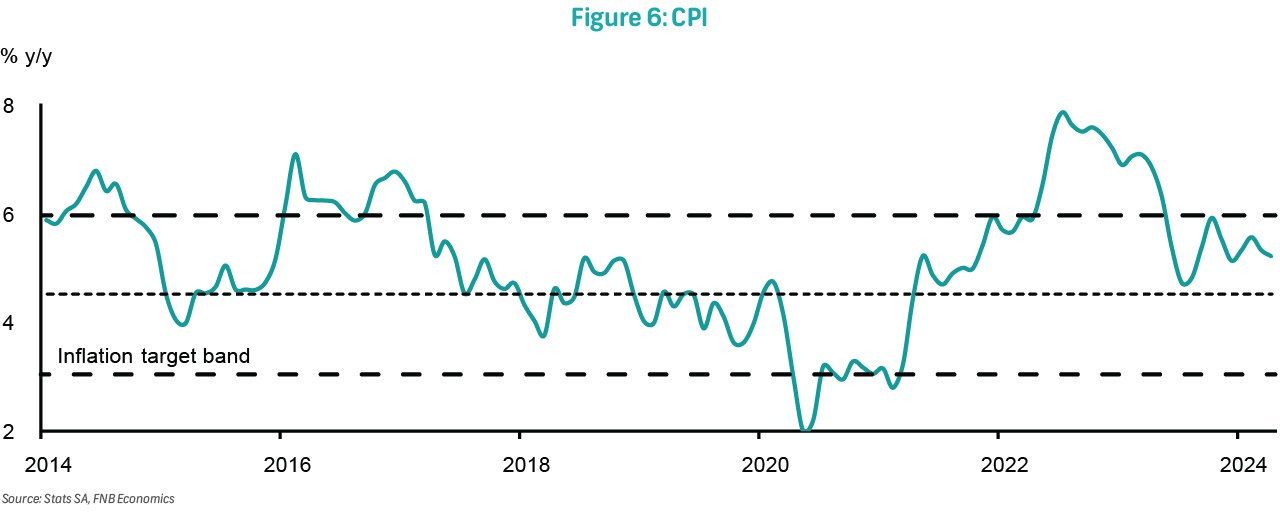 On Wednesday, data on consumer inflation for May will be released. Headline inflation softened to 5.2% in April from 5.3% in March, with monthly pressure of 0.3%. Driving the monthly pressure was core and fuel inflation. Core inflation lifted by 0.2% m/m and 4.6% y/y, primarily driven by alcoholic beverages and tobacco. Fuel increased by 1.9% m/m and 9.0% y/y, while food and NAB inflation continued to slow, settling at 4.7% y/y from 5.1% previously. We expect monthly pressure on headline inflation to ease further to 0.2% in May and annual inflation to remain unchanged. Beyond May, core inflation should stabilise, fuel price dynamics should be more positive, but food inflation should reflect some upward pressure from adverse weather conditions. Average annual headline inflation should be just above 5% for 2024.
