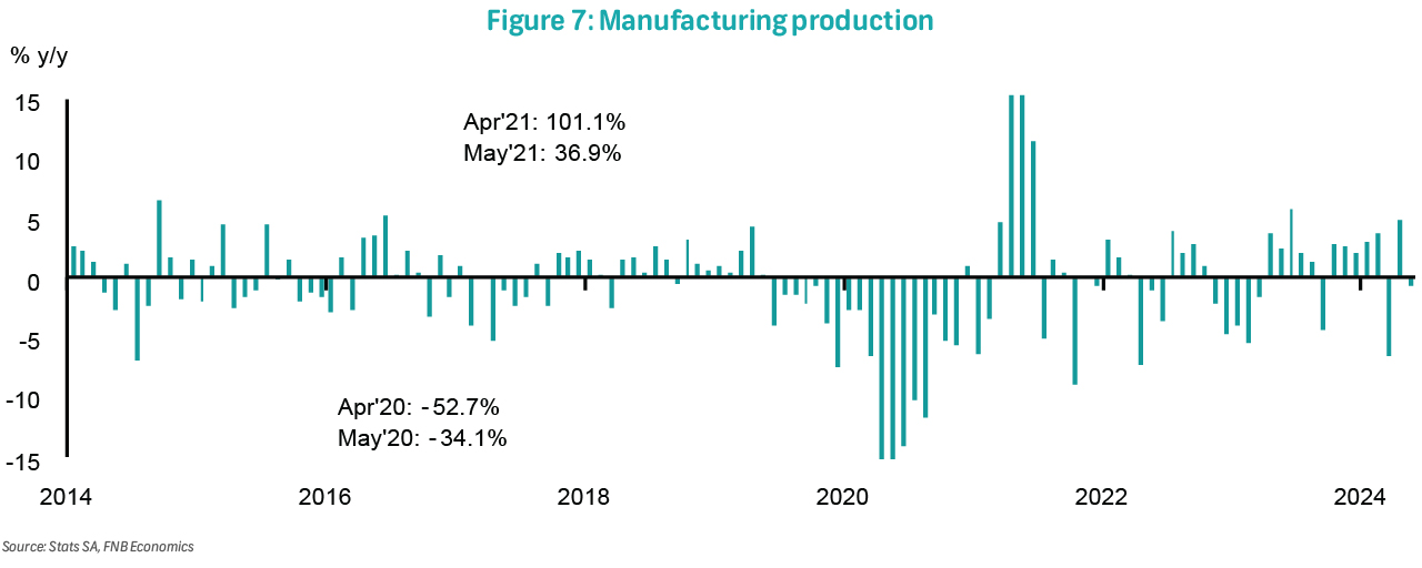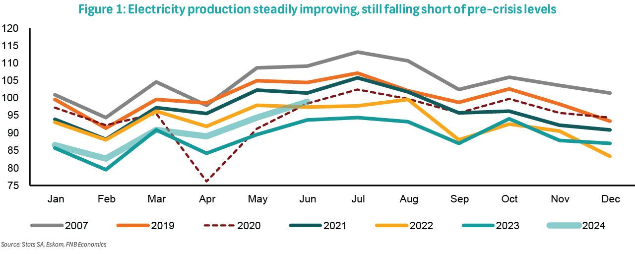 On Thursday, Stats SA published electricity production data for June 2024, revealing a 5.4% y/y expansion and a 2.1% quarterly increase between 1Q24 and 2Q24. In the first half of 2024, electricity production grew by 3.6%, a stark contrast to the 7.3% decline over the same period in 2023 and the 2.5% decline in 2022.