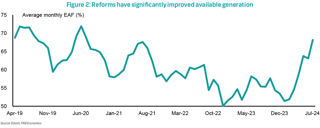 Eskom's energy availability factor (EAF) has averaged around 60% since the start of the year and has surpassed 70% in the last two weeks of July - the highest since July 2020, when the pandemic restricted economic activity. With Eskom's nominal generation capacity at approximately 46 680 MW, this translates to around 33 000 MW of available generation, a substantial improvement from the 16 480 MW available in April 2023. The early return of Kusile Units 1, 2, and 3 last year, along with the successful commercial operation of Kusile Unit 5 in late June, has been pivotal in boosting available generation.