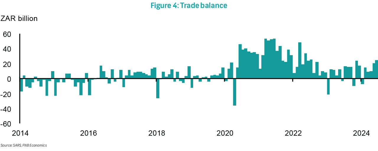 The trade balance recorded a surplus of R24.2 billion in June, up from a downwardly revised R20.0 billion (previously R20.1 billion) in May. This improvement occurred despite a 3.4% monthly decline in exports to R172.0 billion, as a significant 13.6% monthly decline in imports maintained the surplus. Year-to-date (January to June), the decline in imports has been broad-based across major merchandise categories despite a less depreciated rand, reflecting subdued domestic demand. Imports of vehicles and other transport equipment are down 23.3%, followed by machinery and equipment down by 17.6%, and mineral products, which are down by 4.8%. While the reduction in imports signals weakness in the import sector, it also suggests a moderate widening of the current account deficit to 2.0% of GDP from 1.6% in 2023, better than earlier projections.