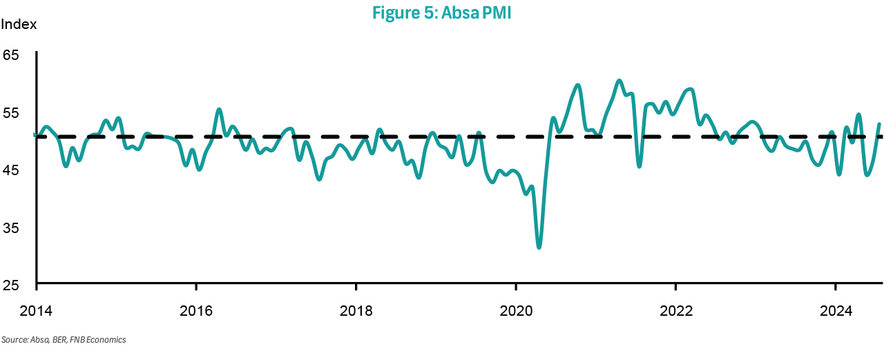 The Absa PMI jumped from 45.7 points in June to 52.4 index points in July, signalling a solid rebound in both domestic and external demand. Business activity surged by 14.5 points to 50.8, while new sales orders soared by 17.5 points to 55.4, both entering expansionary territory. This suggests that the demand that had been put off because of policy uncertainty is now supporting the market and is compounded by export sales. Furthermore, purchasing prices continued to ease, partly reflective of lower fuel prices. However, supplier delivery times are worsening, suggesting that supplier ability to manage rising demand is limited. This could stifle performance going forward, as optimism on near-term conditions continues to rise.