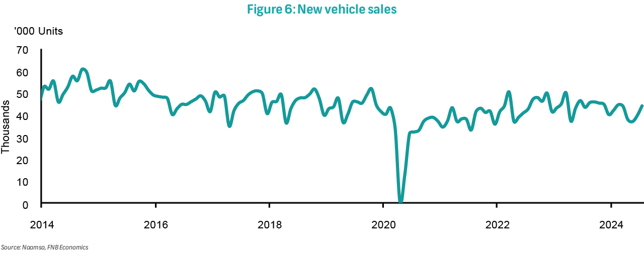 New vehicle sales increased by 657 units to record 44 229 units in July, reflecting a 1.5% y/y rise. Passenger car sales increases by 6.8% y/y, with the rental market's seasonal uplift supporting a solid 17.1% contribution. Nevertheless, light commercial vehicles declined by 8.8% y/y, medium commercial vehicles by 6.6% y/y, and heavy trucks and busses by 3.7% y/y. Year-to-date, new vehicle sales were lower by 6.3% relative to the same period last year. However, the cessation of load-shedding, continued launches of new products, a stronger rand, and the expectation of lower interest rates should support the market going forward.