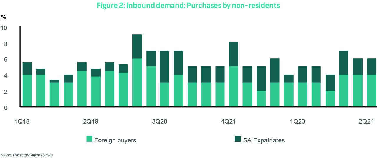 Purchases by foreigners have been relatively muted in recent times. However, data suggests a mild uptick over the past year or so. In 2Q24, these transactions were estimated at 4% of total volumes, a percentage point higher than a year ago, and now largely consistent with the long-term average of 4.2% since 2Q04. Still, they remain below the peak of around 6% recorded in 3Q16. The other aspect pertaining to "inbound demand" involves purchases by South African expatriates. Here, our survey enquires about the volume of expats buying homes locally for investment purposes or upon their return to the country. After reaching approximately 3% in 4Q23, expatriate acquisitions have moderated to 2% by 2Q24. While the significance of expat activity has somewhat recovered from the 2018 lows, when these transactions accounted for just 0.5% of the market, it has remained stable around the long-term average of 2.1% (Figure 2).