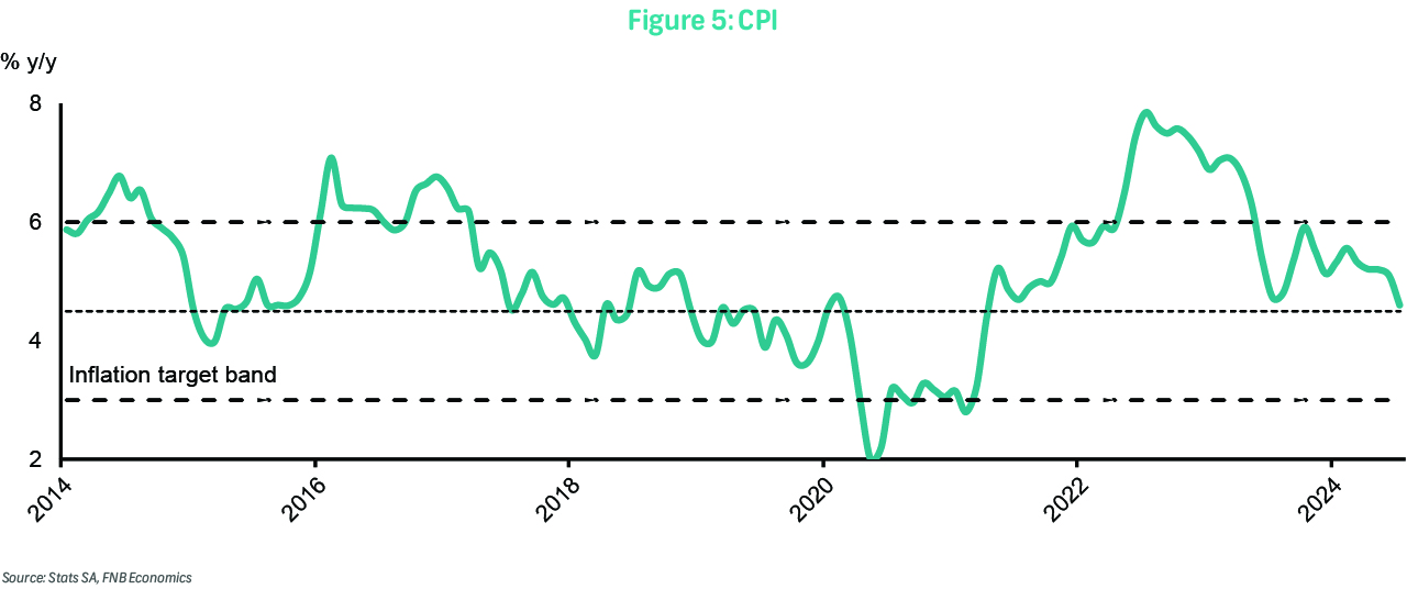 Headline consumer inflation slowed to 4.6% y/y in July, down from 5.1% in June, despite monthly pressure of 0.4%. Core inflation eased to 4.3% y/y, from 4.5% previously, but also reflected monthly pressure of 0.3% from utility services. Electricity price inflation was 11.0% m/m and 12.1% y/y. Average fuel prices fell by 3.6% m/m but were up by 4.5% y/y, down from 7.6% previously. Food and non-alcoholic beverages inflation continued easing to 4.5% y/y from 4.6% previously. Slowing global inflation, stable oil prices, a less depreciated rand, and subdued domestic demand remain supportive to lower inflation this year. We anticipate that inflation will fall below the 4.5% target over the next few quarters but lift at the turn of next year as base effects become less favourable. Nevertheless, this trend should be supportive of headline inflation averaging below 5.0% this year and potentially below 4.5% next year. The risk, however, is that geopolitical tensions flare up, lifting the risk premium on commodity prices and keeping logistical costs elevated.