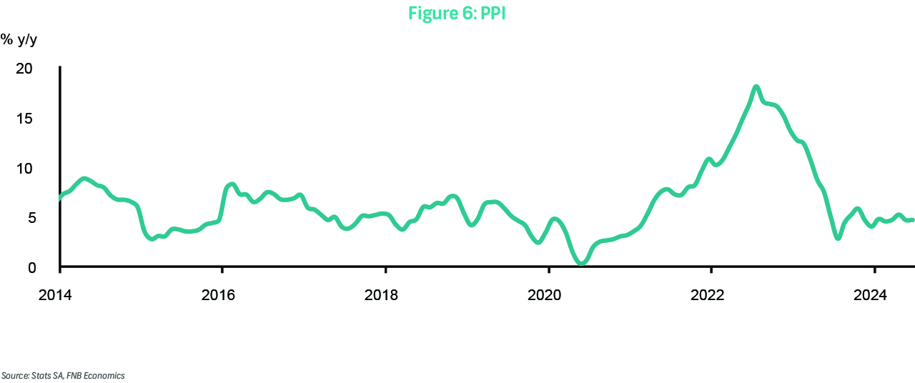 On Thursday, data on producer inflation for July will be released. In June, producer inflation was steady at 4.6% y/y, unchanged from May's print. Monthly pressure was -0.3% after averaging 0.5% in the first five months of the year. Excluding petroleum-related products, producer inflation increased slightly to 4.0% y/y (0.2% m/m) from 3.9% y/y (0.1% m/m) in May. Intermediate producer inflation rose to 2.3% from 0.4%, with monthly pressure steady at 0.6% between May and June. We expect a continued moderation in producer inflation to around 4.3% y/y, with monthly pressure at -0.1%, premised on an average fuel price decline, supported by a less depreciated rand and stable oil prices.