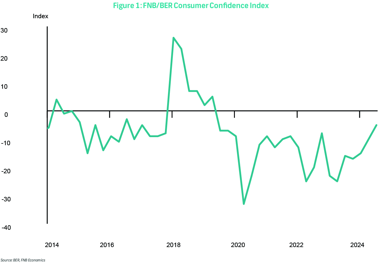 The FNB/BER Consumer Confidence Index continued to improve in 3Q24, rising by seven index points to -5. This marks the highest level in five years, indicating a significant improvement in consumers' willingness to spend. Much of the improvement in sentiment can be ascribed to a marked increase in the household financial outlook sub-index of the CCI (from eight to 14) and a further improvement in the sub-index measuring the appropriateness of the present time to buy durable goods (from -28 to -23). This positive trend is driven by factors such as the formation of a government of national unity, the absence of load-shedding, a stronger rand, lower inflation, and the implementation of the two-pot retirement system.