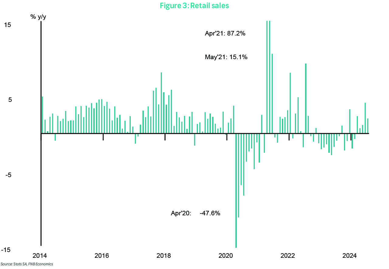 Retail sales continued their positive streak in July, recording 2.0% y/y - a fifth consecutive month of expansion. Nevertheless, the outturn undershot Reuters consensus expectations of 3.2% y/y and marks a significant deceleration from the previous month's robust 4.1% y/y growth. On a month-on-month basis, volumes also retreated, declining by a marginal 0.2%, down from a 1.6% expansion in June. All but two categories saw an increase in volumes. The anaemic shopping activity at hardware shops persisted, with volumes sliding by 6.3% y/y, from -0.9% in the previous month. Nevertheless, the 3Q24 FNB/BER Building Confidence Index showed improvements in sales growth among hardware retailers, albeit off an extremely low base, which spurred sentiment to the best level since 2022. This could signal that hardware sales may be close to the bottom, especially when considering the potential impact of the two-pot pension withdrawals and lower interest rates. Supporting the overall sales volumes was a robust 4.4% increase in general dealer activity and a 5.9% increase in pharmaceuticals sales.