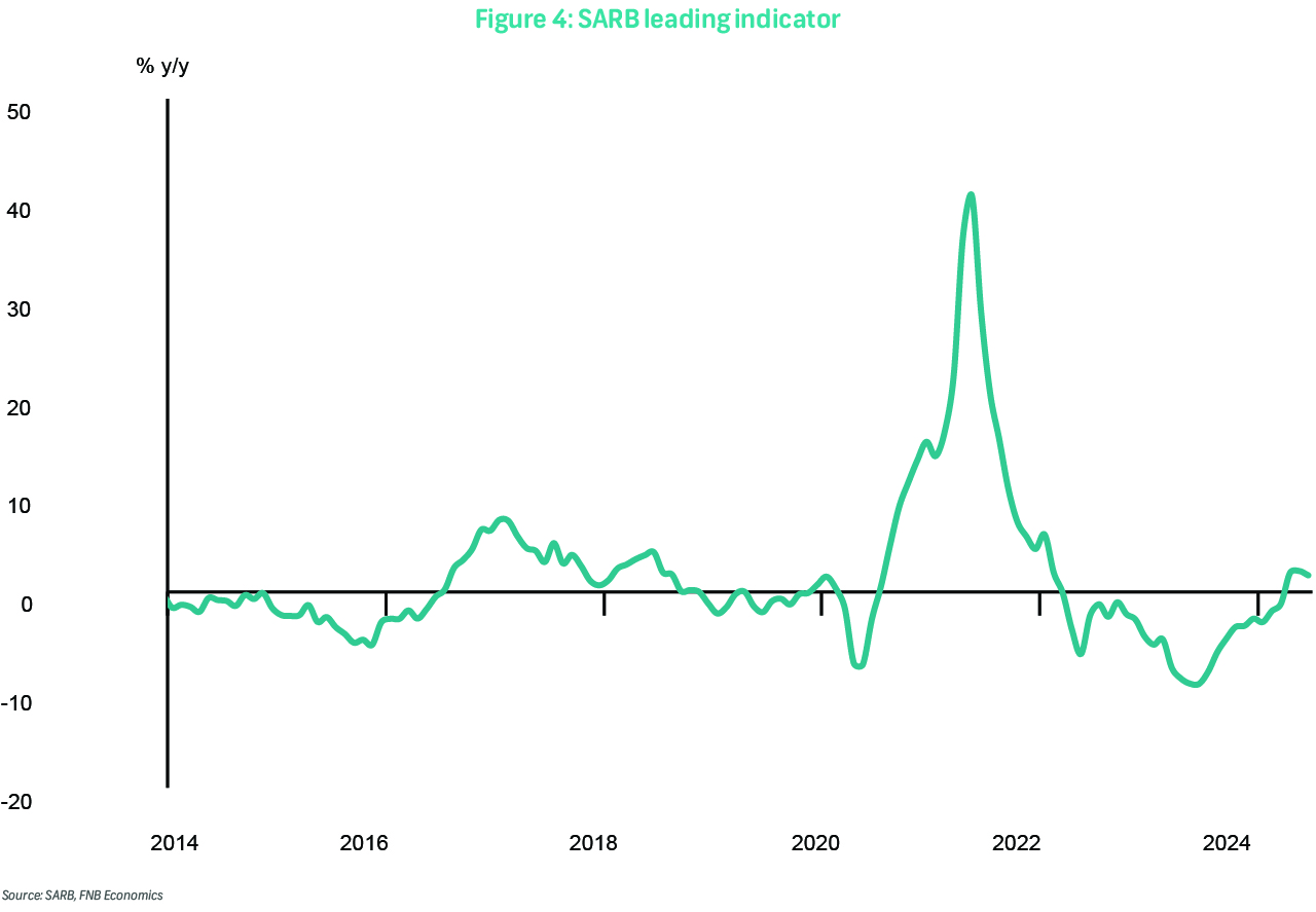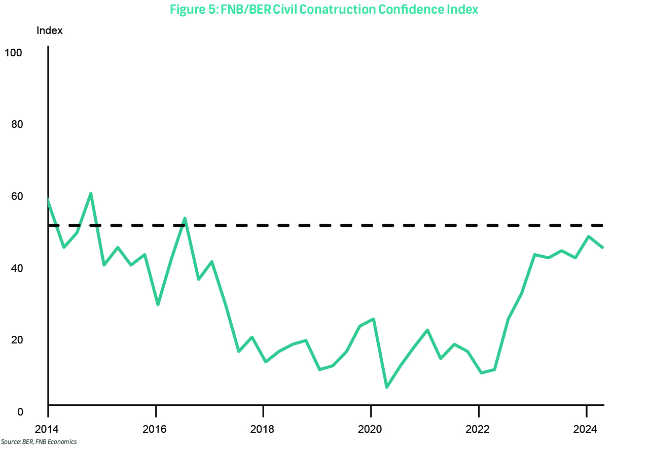 On Thursday, the 3Q24 FNB/BER Civil Confidence Index survey will be published. In 2Q24, the index fell to 44, from a near eight-year peak of 47 points in the previous quarter. This highlighted slowing activity in the sector as well as uncertainty ahead of the elections. Nevertheless, confidence was still above the sample average of 41 points (since 1997), with forward-looking activity indicators showing strong signs of optimism.