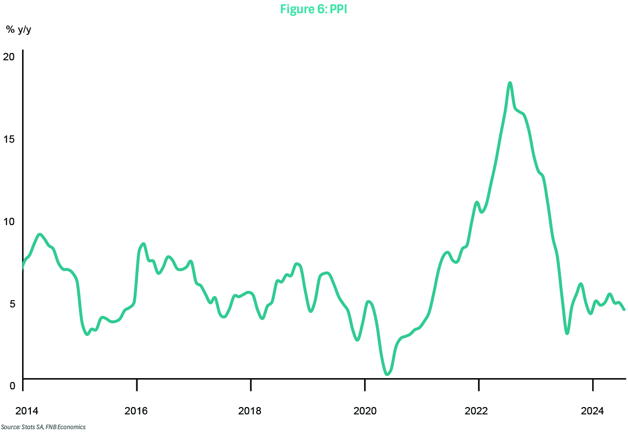 On Thursday, producer inflation for August will be released. In July, producer inflation moderated to 4.2% y/y, down from 4.6% y/y in June. Monthly pressure was -0.2%, reflecting a 4.9% and 1.4% monthly decline in petrol and diesel prices, respectively, as well as a 0.1% monthly decline in food products. Excluding petroleum-related products, producer inflation was even lower at 3.7% y/y, down from 4.0%, with food inflation at 3.3% and transport equipment experiencing 0.9% deflation. We expect producer inflation to have moderated further, falling below 4.0% in August, supported by a less depreciated rand, stable oil prices, and statistical base effects.