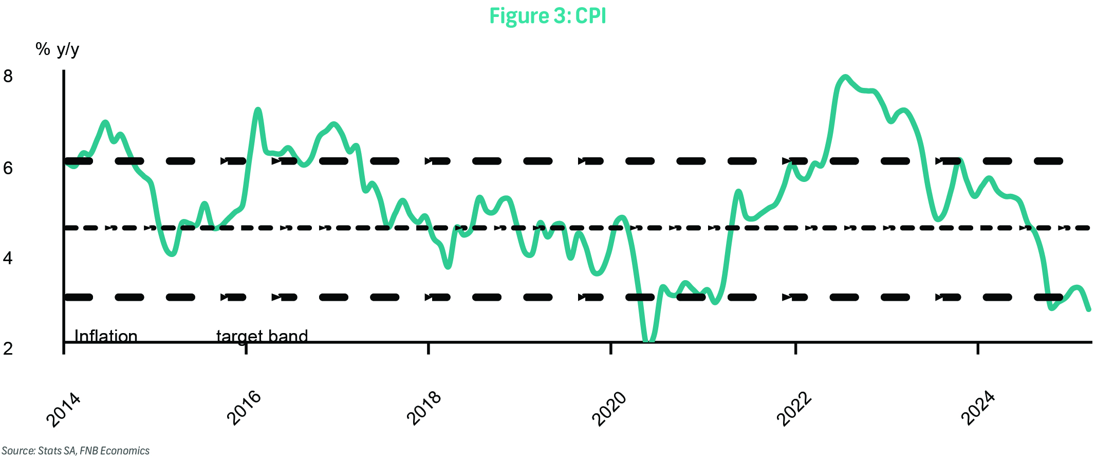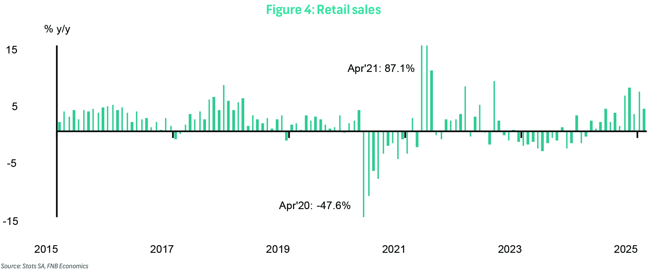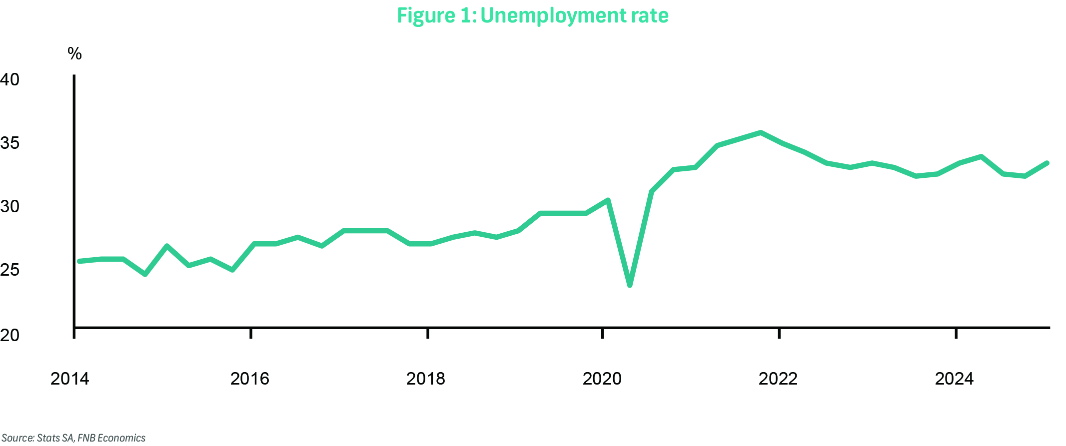The Quarterly Labour Force Survey (QLFS), a household-based employment survey (not seasonally adjusted), reflected a decrease of 290 575 q/q in total employment during 1Q25, following an increase of 131 669 q/q in the previous quarter. However, compared to the same quarter last year, employment improved by 42 517 to 16 787 267. The level of unemployment increased by 236 731 q/q (1 789 y/y), bringing the total number of unemployed individuals to 8 227 678. As a result, the official unemployment rate increased by 1.0ppt to 32.9%. The absorption rate decreased by 0.8ppts to 40.3%, suggesting a moderate deterioration in the economy's ability to create jobs. At this rate, a significant proportion of the working-age population is still left out of the economy, emphasising the need for faster and labour-intensive growth. The near-term cyclical outlook for the labour market is clouded by elevated global uncertainty, including the impact of US trade tariffs. However, continued structural reforms should, over the medium term, support employment creation.
