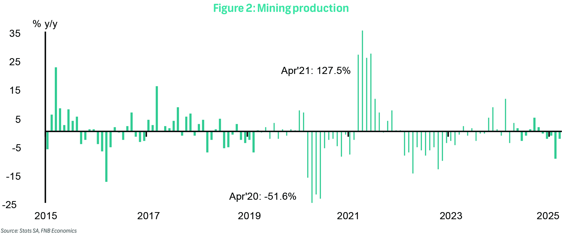 Mining production (not seasonally adjusted) declined again in March by 2.8% y/y after falling by 9.7% y/y (previously -9.6%) in February. This marked five successive months of annual decline. Seasonally adjusted mining output expanded by 3.5% m/m, reflecting a rebound from a 4.1% monthly decline, better than the previously recorded fall of 4.4%. Still, the data confirms that the mining sector dragged GDP growth during the first three months of 2025, with output having contracted by 4.5% q/q, worse than the 0.7% contraction recorded in 4Q24. This, together with the quarterly weakness recorded in the manufacturing and electricity sectors, poses a downside risk to the 1Q25 GDP growth estimate. The remaining high-frequency data to be published over the next two weeks will give a clearer picture of how the economy performed in 1Q25. At this stage, we pencil in 0.2% quarterly GDP growth for 1Q25, which is lower than the 0.6% quarterly growth recorded in 4Q24.