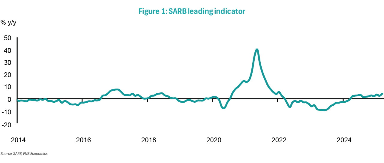 The leading indicator increased by 1.1% m/m in March, rebounding from a 0.2% decline in the previous month. This improvement was driven by gains in five of the seven available component time series, which outweighed the declines in the other two components. The most significant positive influences were a faster six-month smoothed growth rate in the real M1 money supply and a rise in the number of approved residential building plans. Conversely, the largest negative influences were slower six-month smoothed growth rates in new passenger vehicle sales and the composite leading business cycle indicator for South Africa's major trading partners.