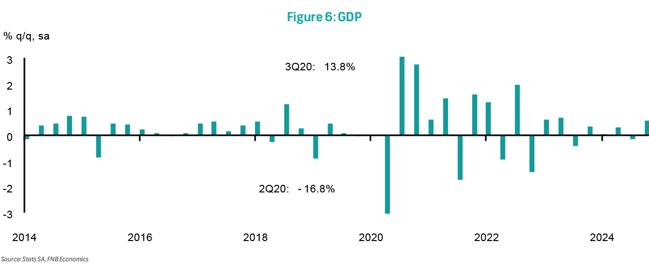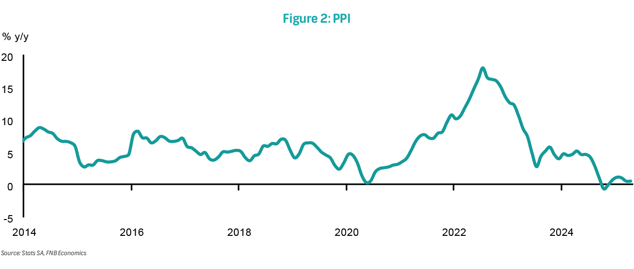 On Tuesday, Gross Domestic Product (GDP) data for 1Q25 will be released. Real GDP (not seasonally adjusted) grew by 0.9% y/y in 4Q24, up from 0.4% in 3Q24. On a seasonally adjusted (non-annualised) basis, the economy expanded by 0.6% q/q, marking a modest rebound from a 0.1% contraction in 3Q24. Although there is uncertainty surrounding the notoriously volatile agricultural sector, and while it may perform relatively well, high-frequency data from other sectors suggest that the economy weakened in the first three months of this year compared to the last three months of 2024. We pencil in a quarterly GDP contraction of 0.1% (final estimate) for 1Q25, reflecting softer economic activity in higher-weighted sectors such as mining, manufacturing and trade.