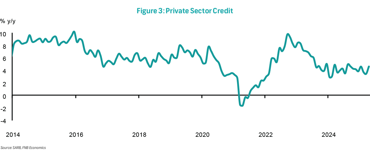 Private Sector Credit Extension (PSCE) growth rose to 4.6% y/y in April, up from 3.4% y/y in March, largely driven by an acceleration in corporate credit growth, which increased to 6.0% from 3.9%. Household credit growth was 3.0%, marginally higher than the 2.9% recorded in March. Within corporate credit, growth in general loans and advances rose to 7.4% from 4.3%, overdraft growth climbed to 12.6% from 10.3%, and mortgage advances grew by 6.2%, slightly up from 6.1% in the previous month. Instalment sales credit growth remained stable and above inflation at 5.0%, compared to 5.1% in prior months, while credit card growth declined sharply to 0.6% from 2.5%. In the household segment, general loans and advances and overdrafts remained in contractionary territory, while mortgage advance growth was stable at 2.3%, unchanged from the prior month. Growth in other household credit categories remained above inflation, with instalment sales credit at 6.2% and credit cards at 8.5%.