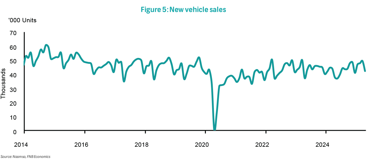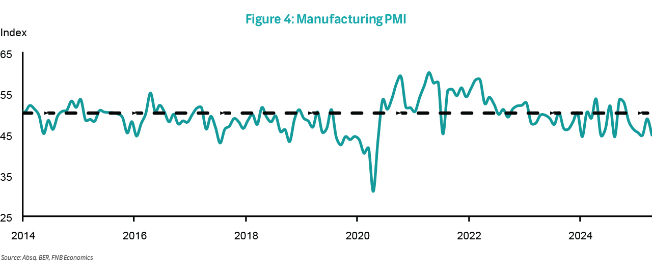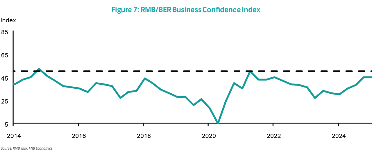 On Wednesday, the RMB/BER Business Confidence Index (BCI) for 2Q25 will be published. The BCI flatlined at 45 index points in 1Q25. While the index remained above the long-term average of 43 points and still reflected improvement from the 30 points recorded at the start of 2024, it nevertheless highlighted stalled momentum. In fact, all sectors except new vehicle dealers reported a fall in sentiment, suggesting growing pessimism across sectors.