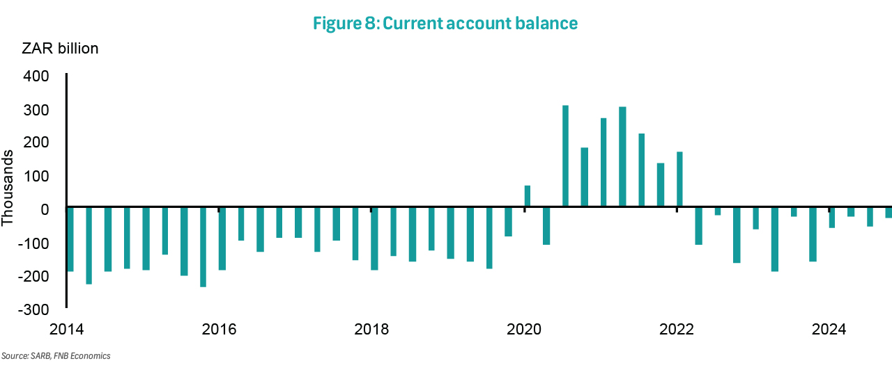 On Thursday, data on the current account balance for 1Q25 will be published. The current account deficit narrowed again, recording R31.6 billion in 4Q24 from R55.6 billion in 3Q24. As a percentage of GDP, the current account deficit was 0.4%, improving from 0.8% in 3Q24. For 2024, the deficit was 0.6% of GDP, better than 1.6% in 2023. The narrowing of the deficit in 2024 was on account of a wider trade surplus, which doubled from 1.5% of GDP in 2023 to 3.0% in 2024. This is while the services, income, and transfer (SIT) account deficit widened to 3.6% of GDP from 3.1% in 2023. The strength in gold prices and other safe-haven commodities, versus softer oil prices, has remained supportive to SA's terms of trade in the near term. Over the medium term, the unwinding of logistical constraints and stronger trade relations will be important for export growth.