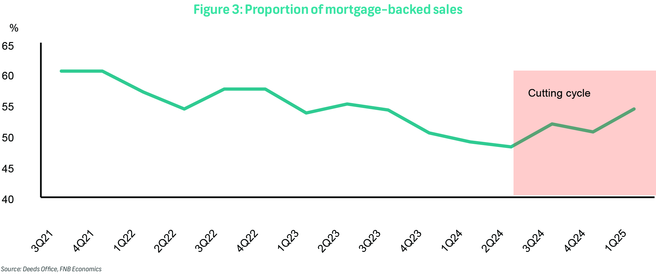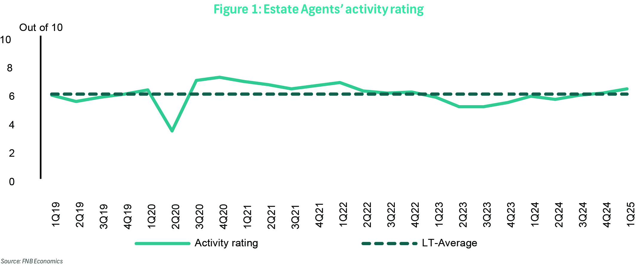 Yet, during this same period, FNB's Estate Agents Survey has consistently reflected relatively upbeat sentiment among agents—driven by buyer inquiries, property viewings, and expectations for future activity. This optimism is further supported by a recovery in the agents' activity rating, which has returned to its long-term average (Figure 1). The disconnect suggests that while interest in property remains, it is not translating into financed transactions.