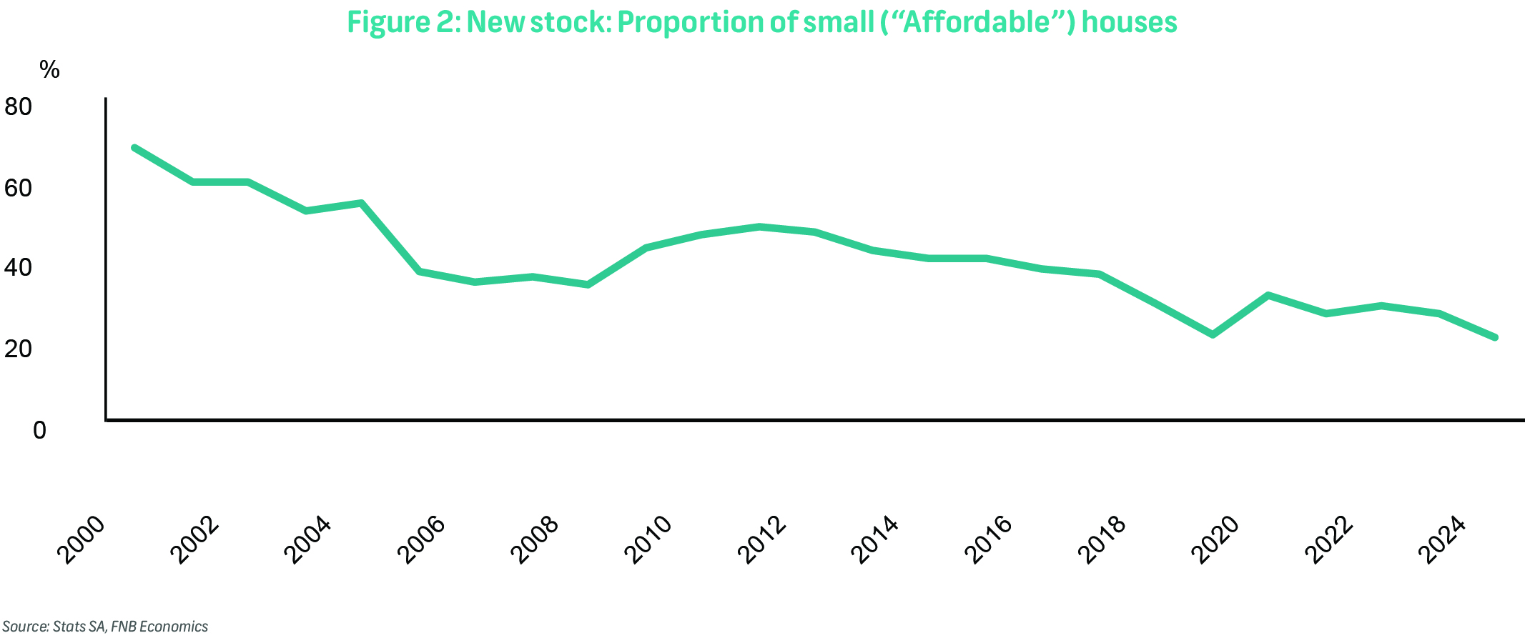 One explanation is that interest rates haven't fallen quickly or significantly enough to entice these buyers. However, a more compelling reason may be the lack of affordable housing options. The turnover rate for existing affordable homes is low, and new supply at accessible price points—particularly near employment hubs—is severely limited. As a proxy, the share of newly-built homes smaller than 80m2 (often used to represent affordable housing) has plummeted from 67% of total new stock in 2000 to just 20% in 2024 (Figure 2).