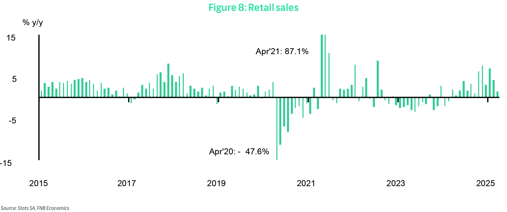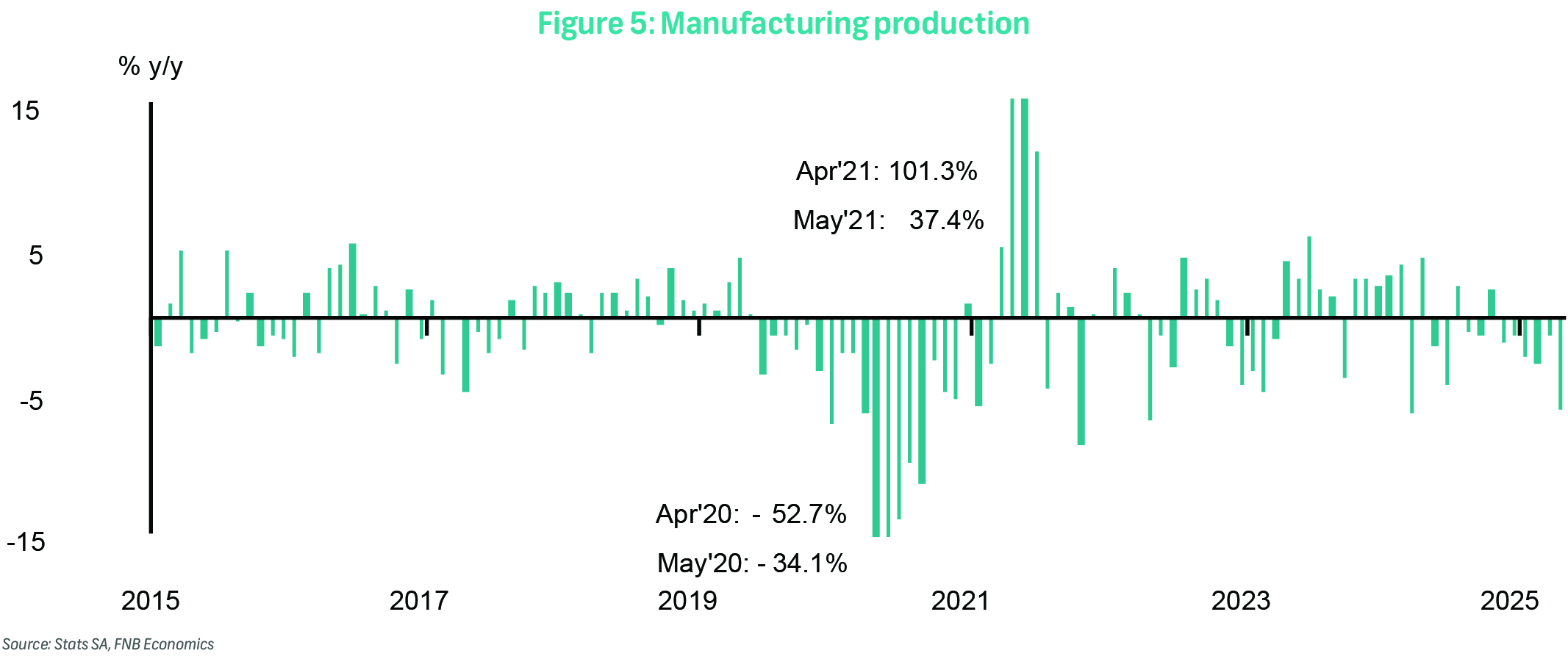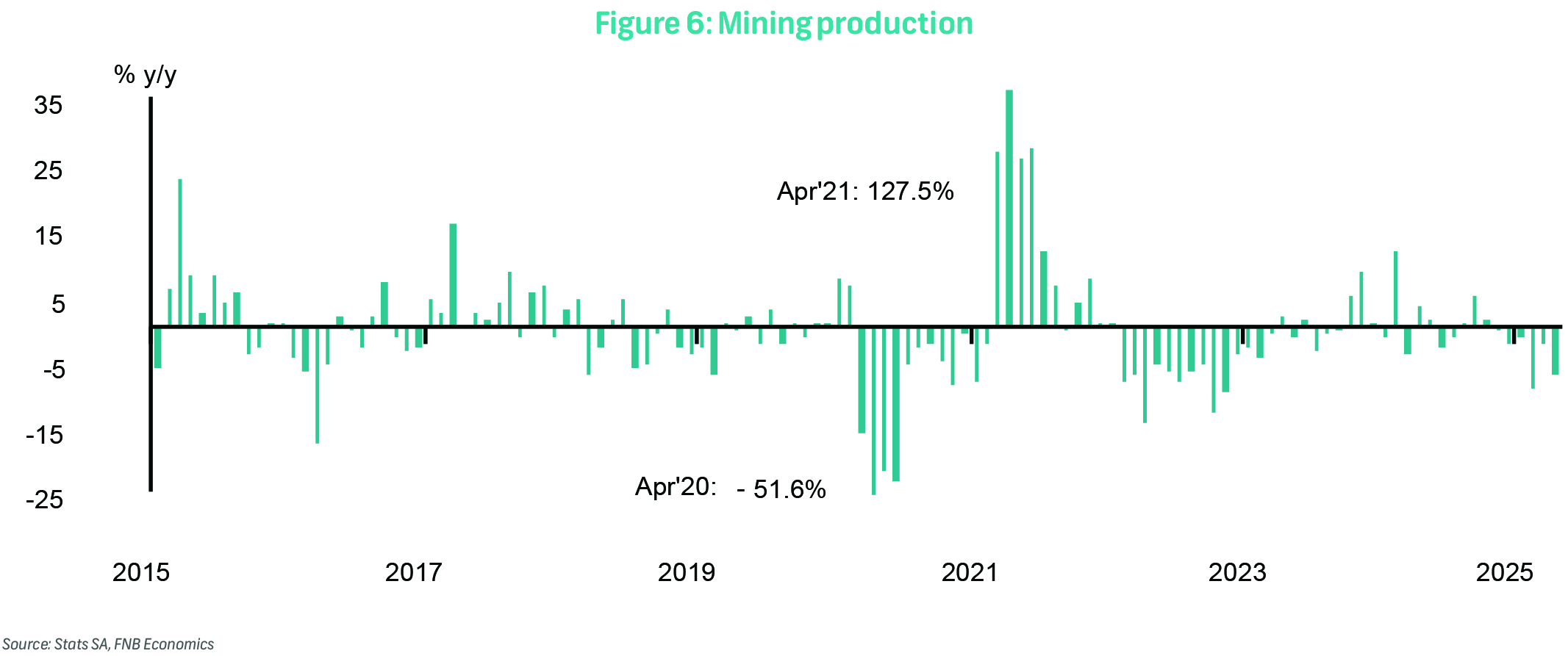 Mining production (not seasonally adjusted) remained weak into the start of 2Q25, with output contracting sharply by 7.7% y/y in April following a 2.5% decline in March (revised from -2.8%). This marked the sixth consecutive month of annual decline. The outcome was worse than the Bloomberg consensus forecast of a 4.0% decline and largely reflected the disruptive impact of breakdowns and third-party supply issues affecting Platinum Group Metals (PGMs). Seasonally adjusted mining output rose modestly by 0.6% m/m, a moderation from the 3.6% monthly increase recorded in March.