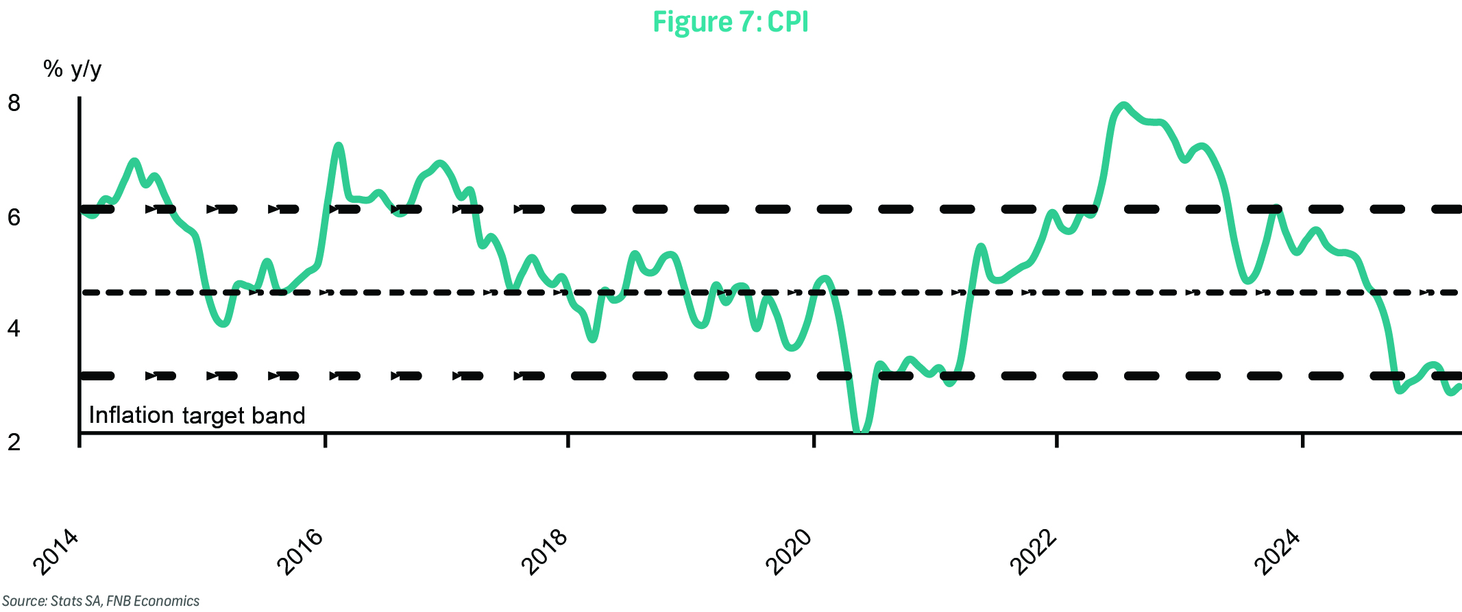 On Wednesday, the Consumer Price Index (CPI) for May will be published. In April, headline inflation ticked up marginally to 2.8% y/y, up from 2.7% in March. Monthly inflation registered at 0.3%, driven primarily by rising prices in food and non-alcoholic beverages (NAB), with meat and vegetables being the main contributors. Despite this uptick, we continue to anticipate subdued inflation in the coming months, supported by softer oil prices, a strengthening rand, and sluggish economic activity.