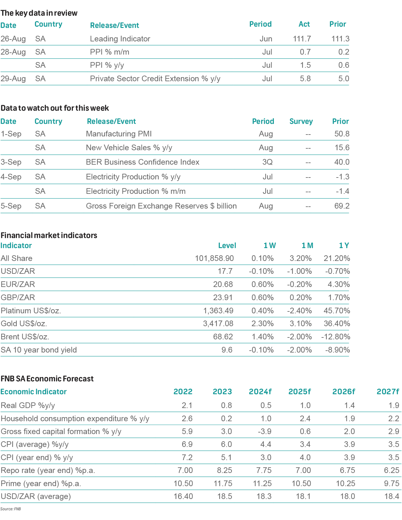 On Thursday, the RMB/BER Business Confidence Index (BCI) for 3Q25 will be published. In 2Q25, the BCI declined by five points to 40, signalling a pause in business sentiment recovery that began in 2Q24. Despite remaining above the 2023-2024 average, confidence dipped slightly below the long-term norm. The results were shaped by several external and domestic factors that prevailed at the time, including diplomatic tensions between the US and SA, global trade uncertainty, and persistent local logistical challenges.