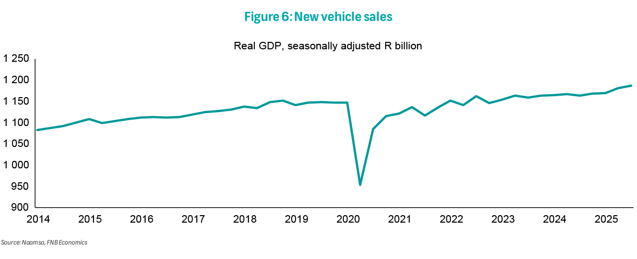 The South African Reserve Bank (SARB) has delivered 150-basis points (bps) of interest rate cuts to date, a substantial easing that has supported household spending, including on productive assets such as new vehicles. We anticipate further, gradual rate cuts from next year, with the repo rate expected to decline to around 6.0% by the end of 2028. Although real rates remain restrictive, the SARB may see this as appropriate in anchoring inflation expectations around the new 3.0% target over the next two years.