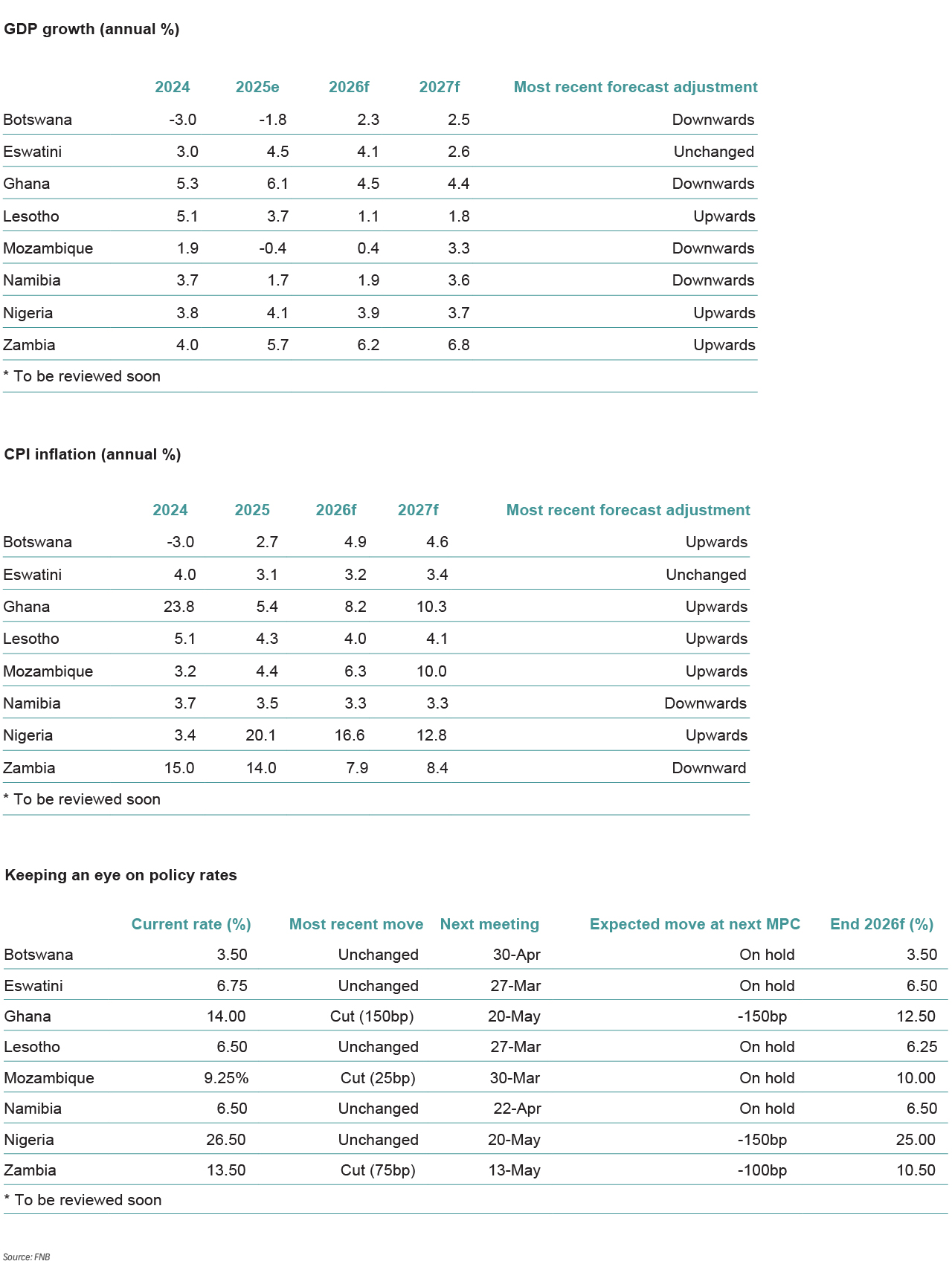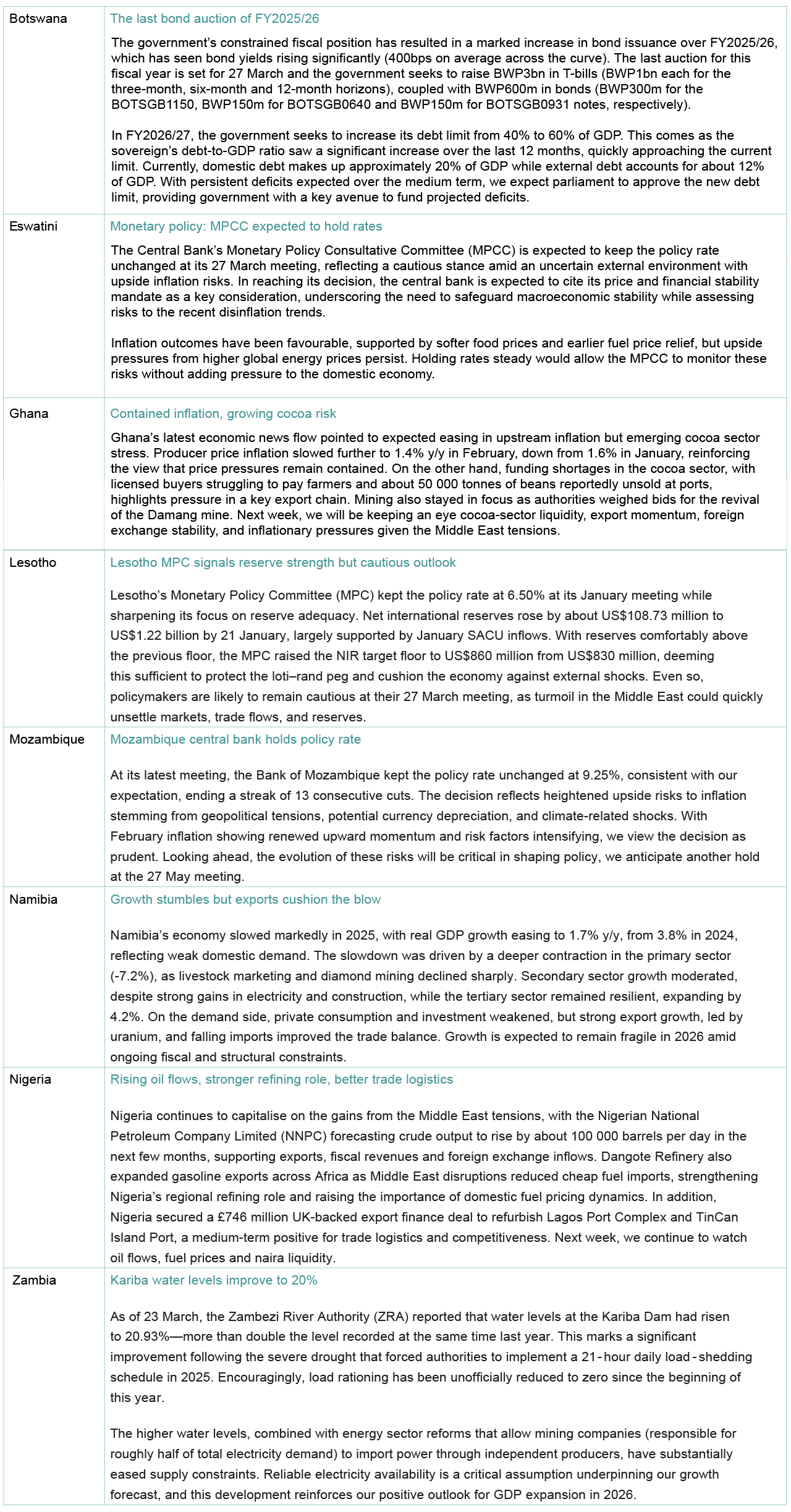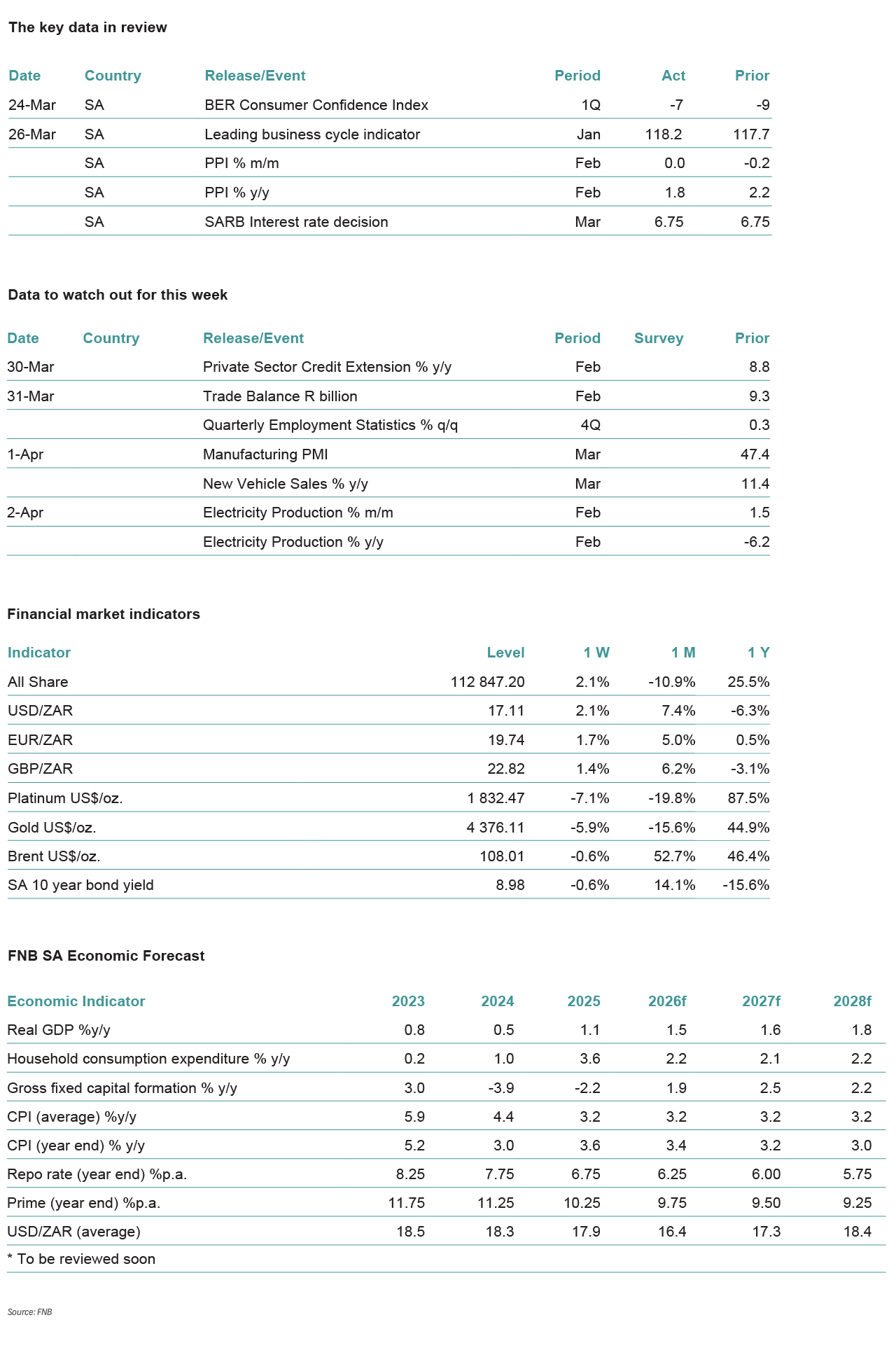 The South African Reserve Bank's (SARB) Monetary Policy Committee (MPC) kept the policy rate unchanged at 6.75% at its March meeting, as expected amid the recent war in the Middle East. Unfortunately, the news flow around the war remains discouraging. While talks of a ceasefire have intermittently led to some oil price retreat, the language around the war remains concerningly escalatory and should sustain volatility. The MPC's messaging highlights the uncertain operating environment, but the central bank is resolute on its inflation objective and could raise rates if the supply shock does not abate.