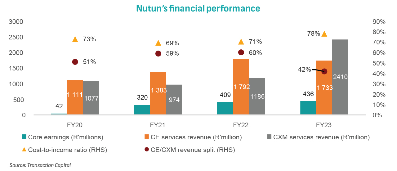 Nutun combines its proprietary technology and data and analytics competencies to provide a broad range of business services to an increasingly global client base - with a focus on SA, Australia, and the UK. The global business earns hard currency revenues, while the cost base is mainly local.