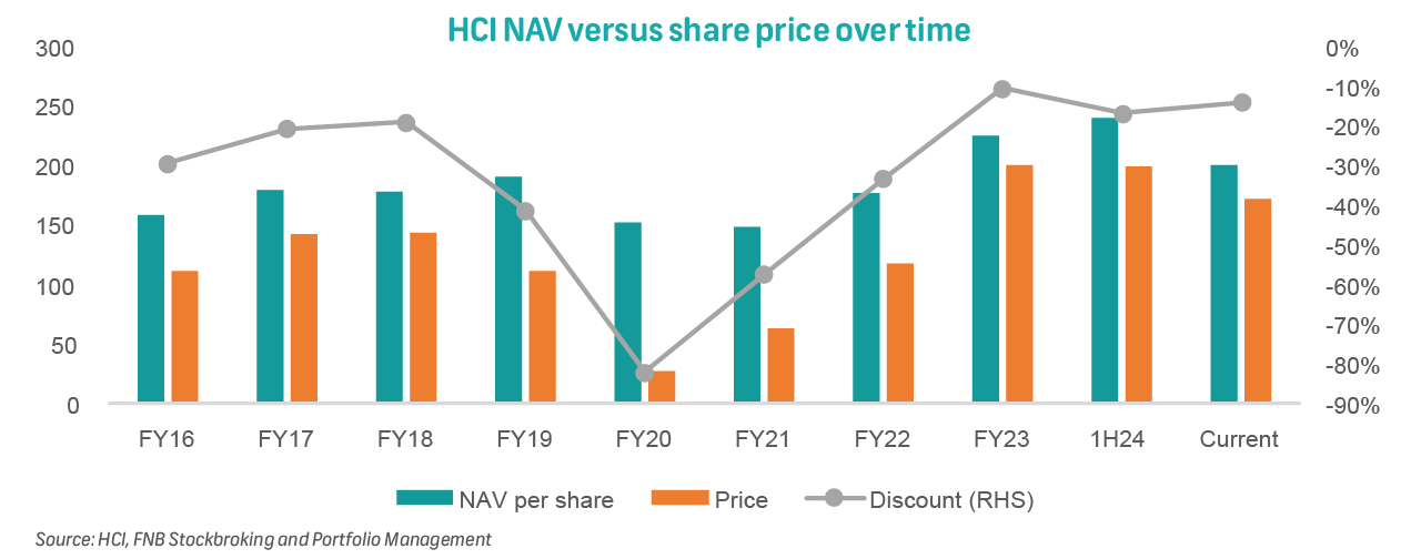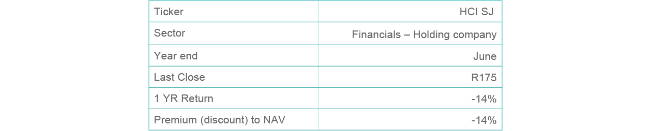 Applying market values to the listed investments, the group trades at a current NAV per share of R200, representing a discount of 14% - against an average discount to NAV of ~25% historically. This seems a little stretched in our view.