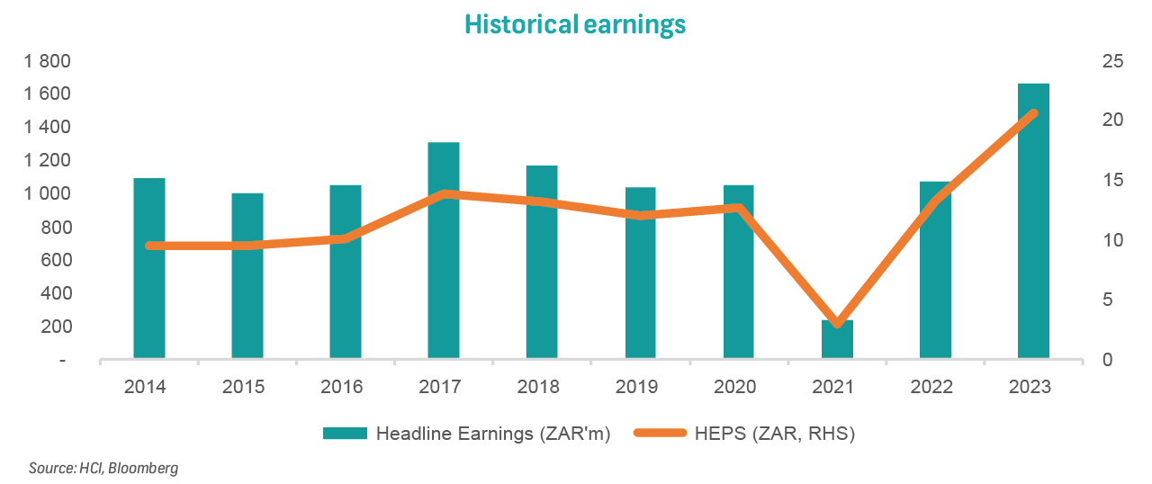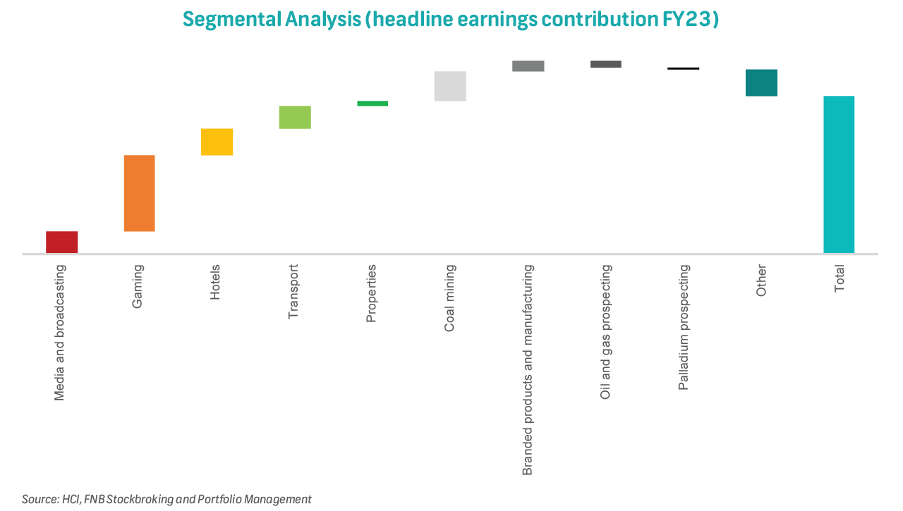 More recently, headline earnings for 1H24 declined 13% against a tougher base (FY23: +41% y/y), dragged by losses in oil and gas and palladium prospecting activities. The FY23 result was driven by a general improvement in the underlying businesses, but especially hotel operations, post-Covid.