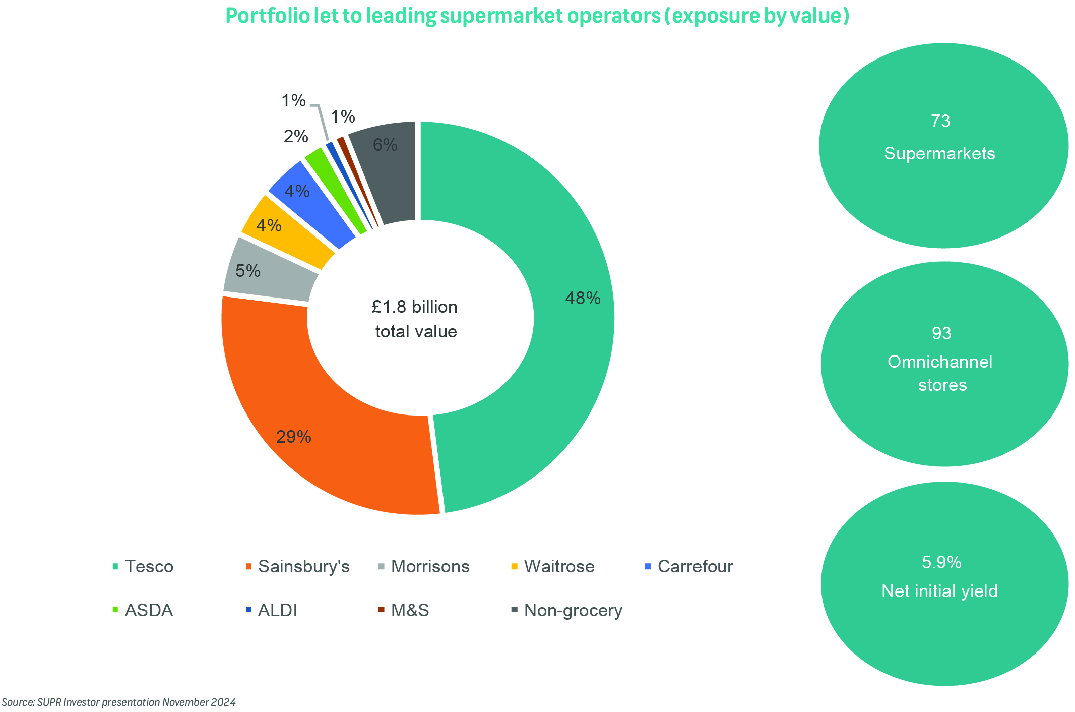 The company's key tenants continued to perform strongly with impressive revenue growth. Sainsbury's and Tesco, representing 77% of the portfolio by value, reported like-for-like sales growth of 10.3% and 7.7% respectively in their full-year results and both reported even higher sales growth figures from their large format stores, like those owned by SUPR, up by 11% and 8.2%, respectively.