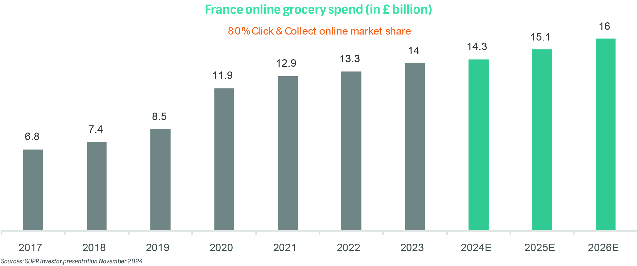 Online market share in France has been permanently enlarged due to an increase in take up throughout the pandemic. The channel grew 93% between 2018 and 2024 and has been further strengthened by investment programmes by operators such as Carrefour.