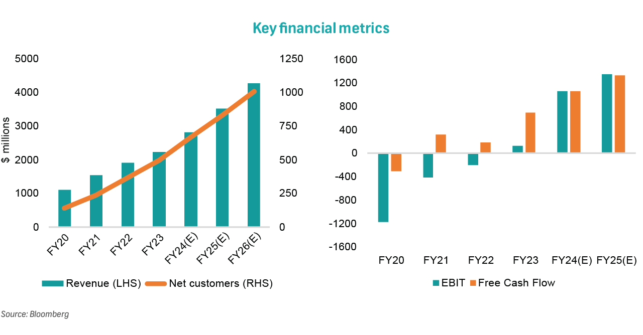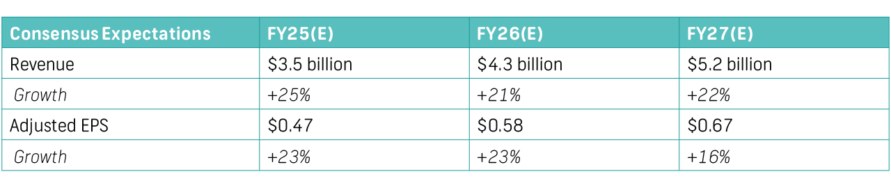 Recent results for the company have also been quite impressive. For 3Q24, revenue climbed 30% y/y to $726 million, EBIT was up 69% y/y to $276 million, and adjusted EPS rose 43% y/y to $0.10. Looking ahead to the company's 4Q24 and FY24 results (due around 5 February 2025), revenue growth is expected to come in at ~28% and ~26% for the quarter and the full year, respectively. This is set to filter into adjusted EPS growth of ~39% and 52%, respectively.