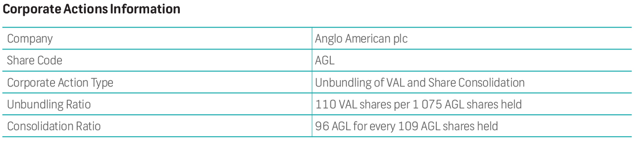 Anglo American plc (AGL) will demerge a portion of its stake in Valterra Platinum Ltd (VAL) to AGL shareholders, in the ratio of 110 VAL shares per 1 075 AGL shares held. This will be immediately followed by a share consolidation in the ratio of 96 AGL shares for every 109 AGL shares held.