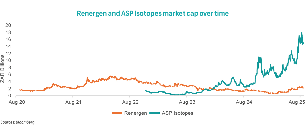 ASP Isotopes will acquire the entire issued ordinary share capital of Renergen after listing. Renergen shareholders will receive 0.09196 new ASPI shares for every one Renergen share held. This implies a substantial premium of ~41.3% on the volume weighted average price (VWAP) of R6.68 over the 30 trading days prior to the acquisition announcement. ASPI was opportunistic in its approach to Renergen shareholders. Renergen was taking substantial financial strain because of continued delays and cost overruns at its Virginia project (spanning natural gas and helium).