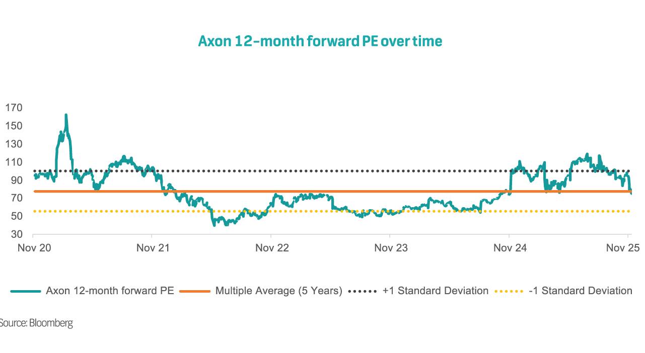 Axon sees multi-year tailwinds from AI, cloud migration, and integrated ecosystem offerings. We agree that the total addressable market for the company is substantial and together with the strong revenue performance and future-facing metrics (bookings, ARR, and NRR), they make for a continued attractive growth picture. Recent price action has derated the stock to what we believe to be a fairer entry point.