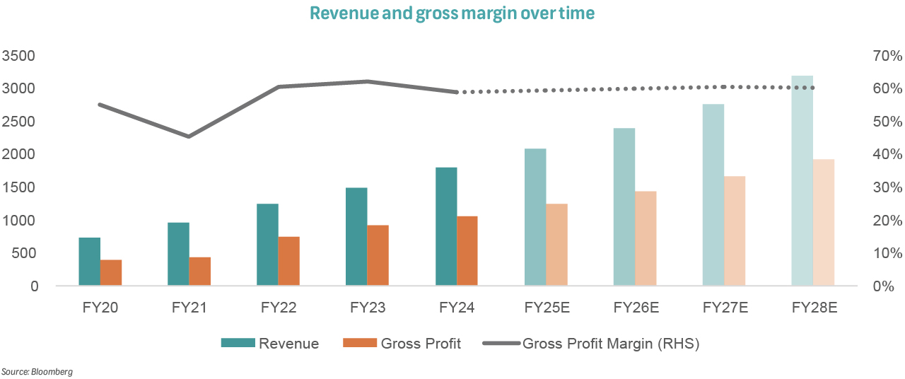 The gross margin has expanded from 45% in FY21 to ~60% where it is expected to remain. This is despite a strong expansion in margin of 120-basis points (bps) y/y to 62.7% in 3Q25, supported by pricing discipline, favourable product mix, and improved operational efficiencies.
