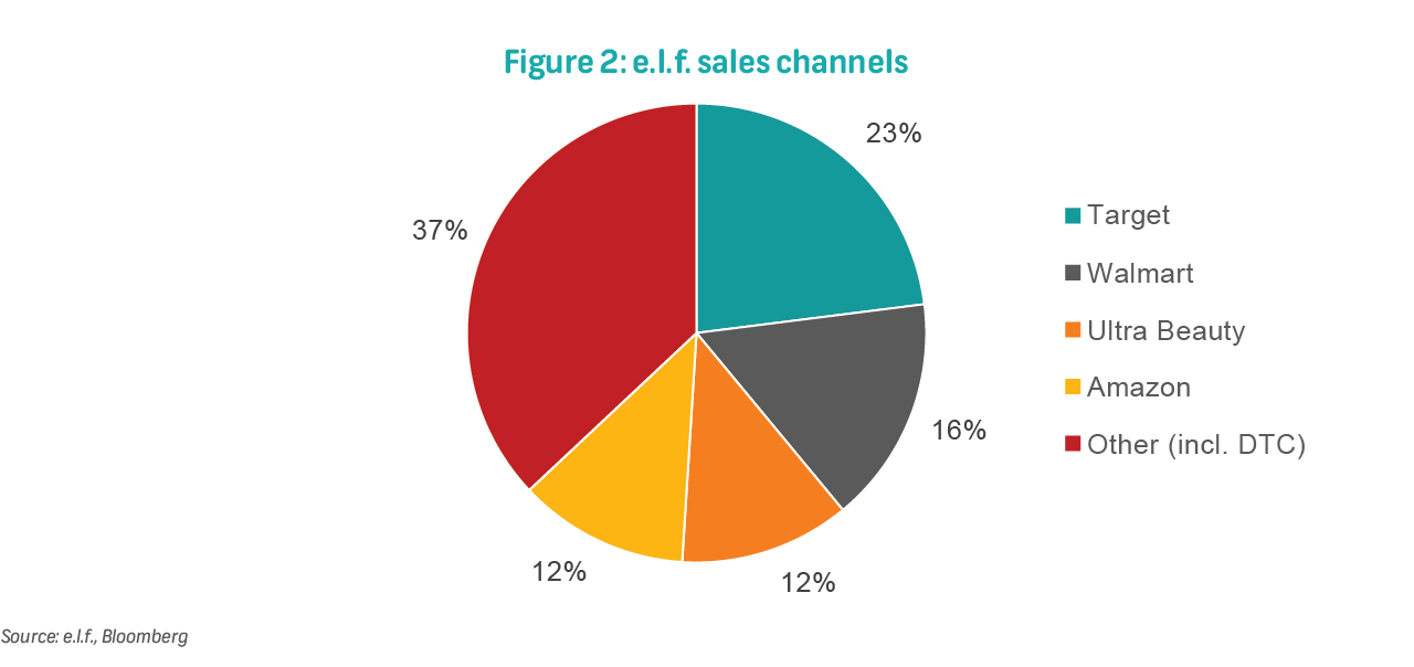 e.l.f. operates mainly in the wholesale channel, distributing its products through Target, Walmart, Ultra Beauty and Amazon in the United States (US); Shoppers in Canada; Superdrug and Boots in the United Kingdom (UK); and selected retailers elsewhere. Direct- to-consumer is online only. The company recently began selling e.l.f. brands in premium global beauty specialist retailer Sephora, who currently has an exclusive wholesales relationship with the rhode brand. The e.l.f. brands have enjoyed notable early success since it launched its products in Sephora. This new distribution partnership will also help the company expand its reach into more countries globally.