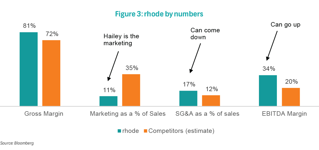 rhode is unique in that it has a limited product line and is deeply committed to its mission to produce "one of everything really great". The acquisition was immediately accretive and will be a major contributor for e.l.f. from FY27 onward. The company has sustainably high margins relative to competitors, with room for further expansion.