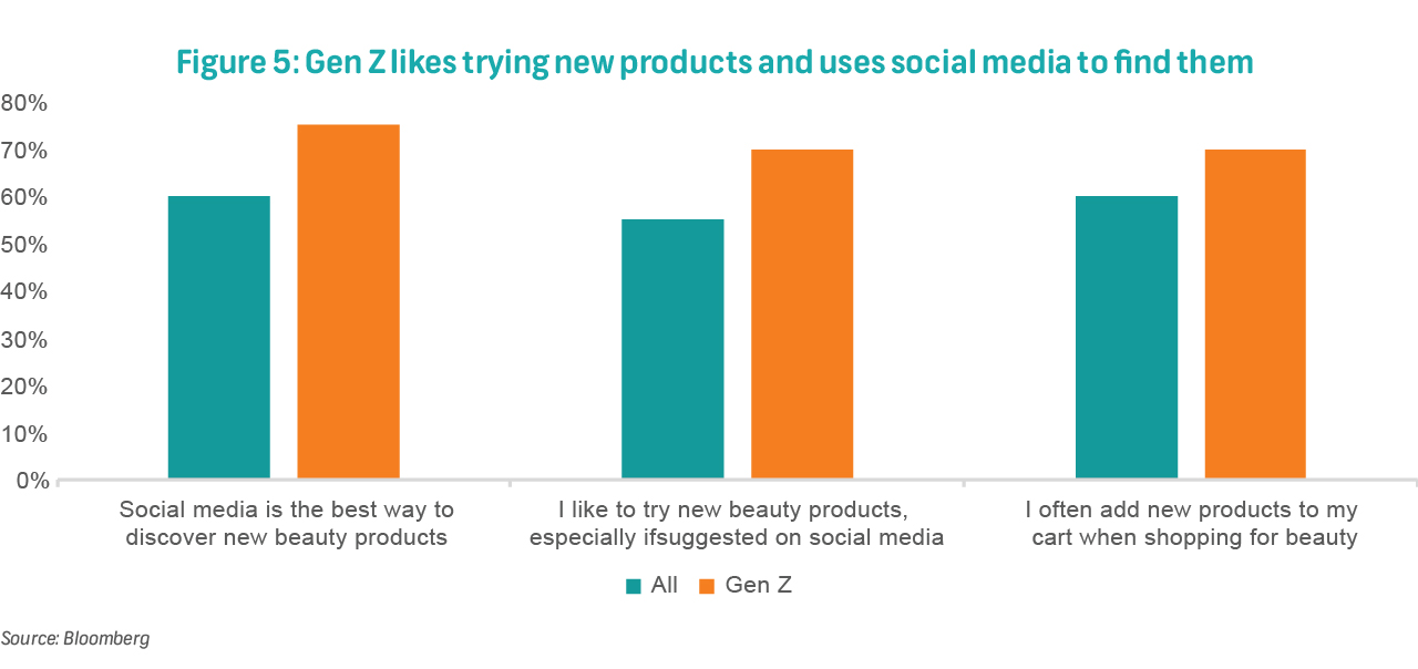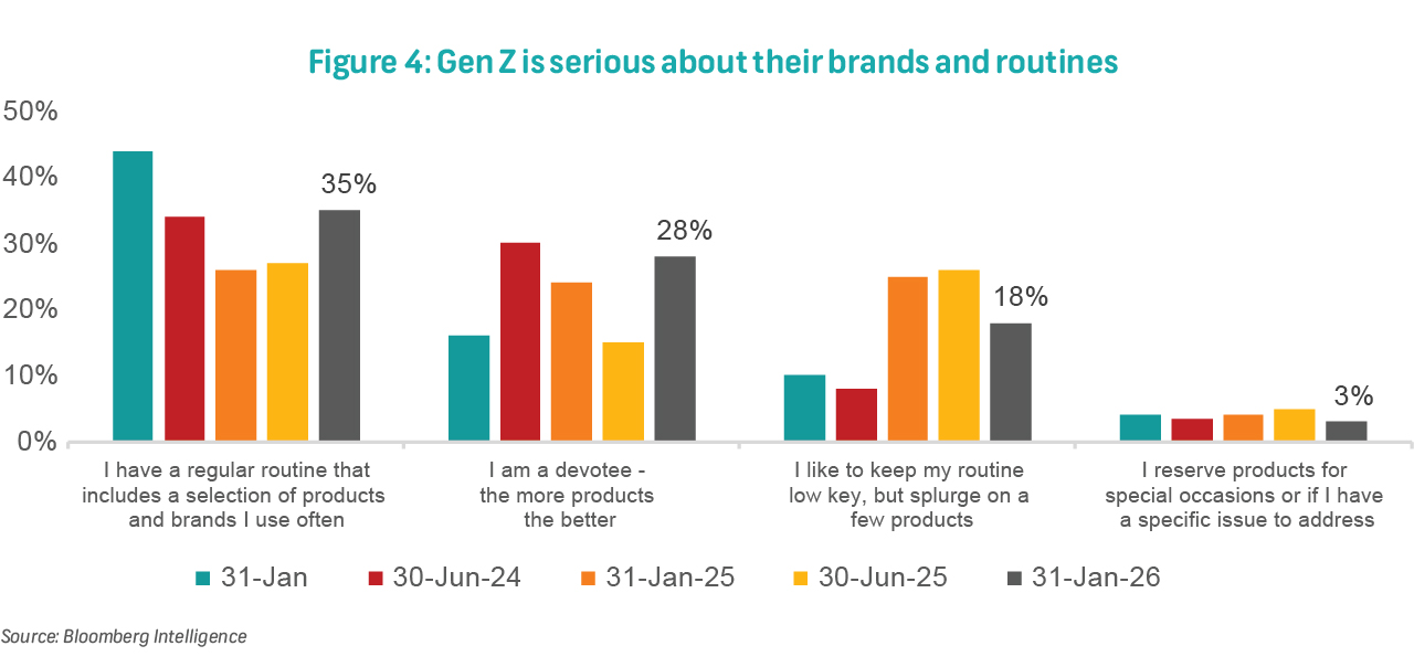 In the US, e.l.f. products were found to be used by 82% of Gen Z respondents in Bloomberg Intelligence's latest beauty consumer survey. This is not surprising given the comparatively lower price point versus other mass brands, the product imitating the best of premium (that will not be affordable for Gen Z consumers), and e.l.f.'s proximity to younger consumers given its social media led marketing and engagement strategies. rhode was also noted as a heavily favoured, aspirational, brand.