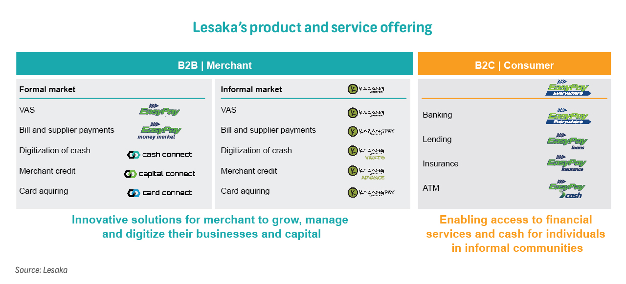 Lesaka is a South African financial technology company focused on delivering financial services to consumers (B2C) and merchants (B2B) in Southern Africa, through proprietary banking and payment technologies. Lesaka offers banking, lending, and insurance solutions to consumers as well as cash management solutions, bill payment technology, value-added services, business funding and card acquiring solutions to formal and informal retail merchants.